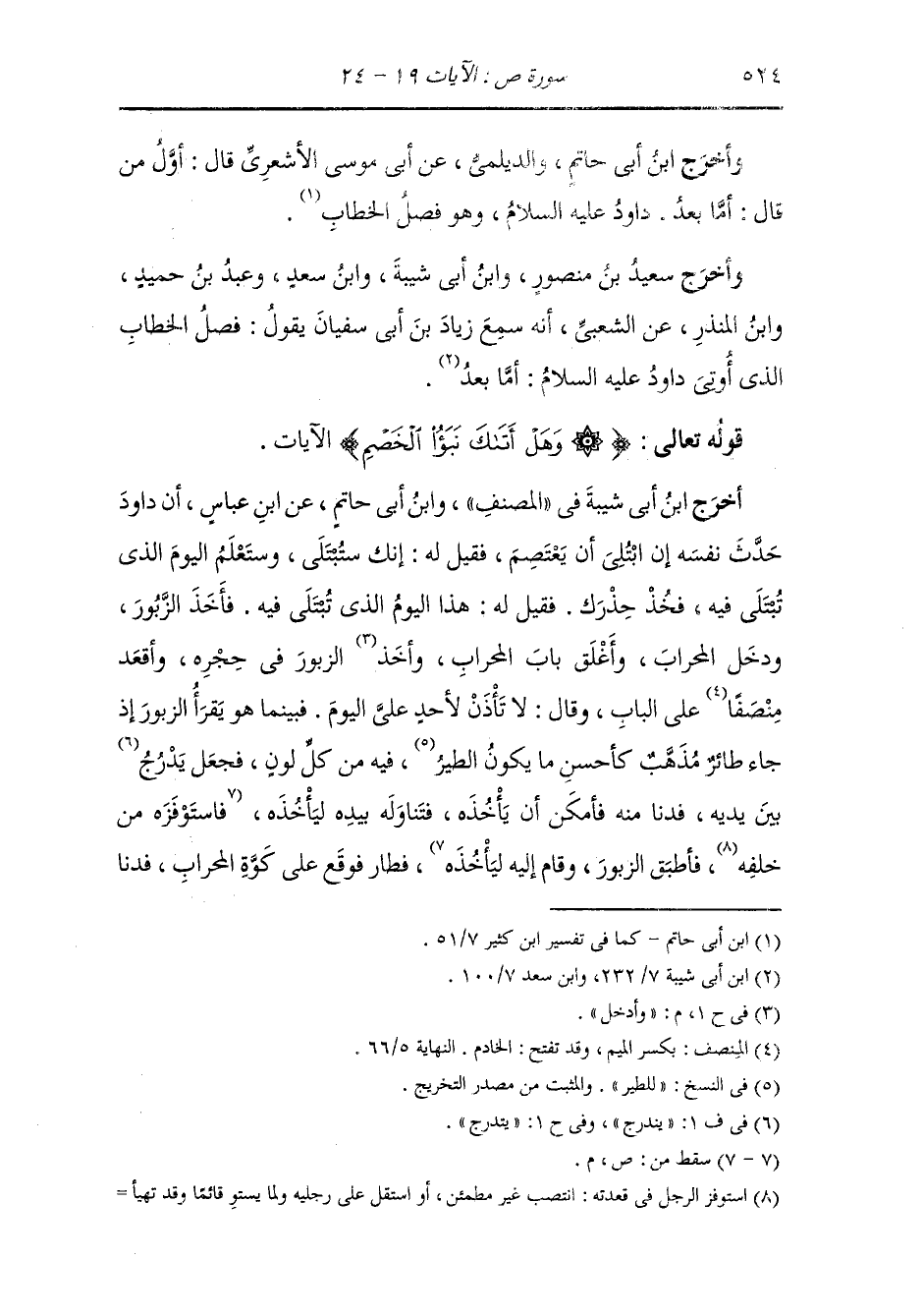 وأخرج عَبد بن حُمَيد ، وَابن جَرِير ، وَابن المنذر عن أبي عبد الرحمن رضي الله عنه {وفصل الخطاب} قال : فصل القضاء.