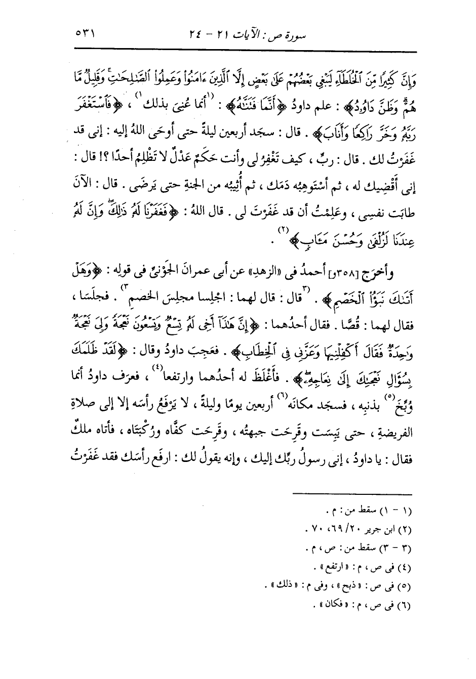 أي لا تمل {واهدنا إلى سواء الصراط} أي أعدله وخيره {إن هذا أخي له تسع وتسعون نعجة ولي نعجة واحدة} يعني تسعا وتسعين امرأة لداود وللرجل نعجة واحدة فقال {أكفلنيها وعزني في الخطاب} أي قهرني وظلمني قال {لقد ظلمك بسؤال نعجتك إلى نعاجه