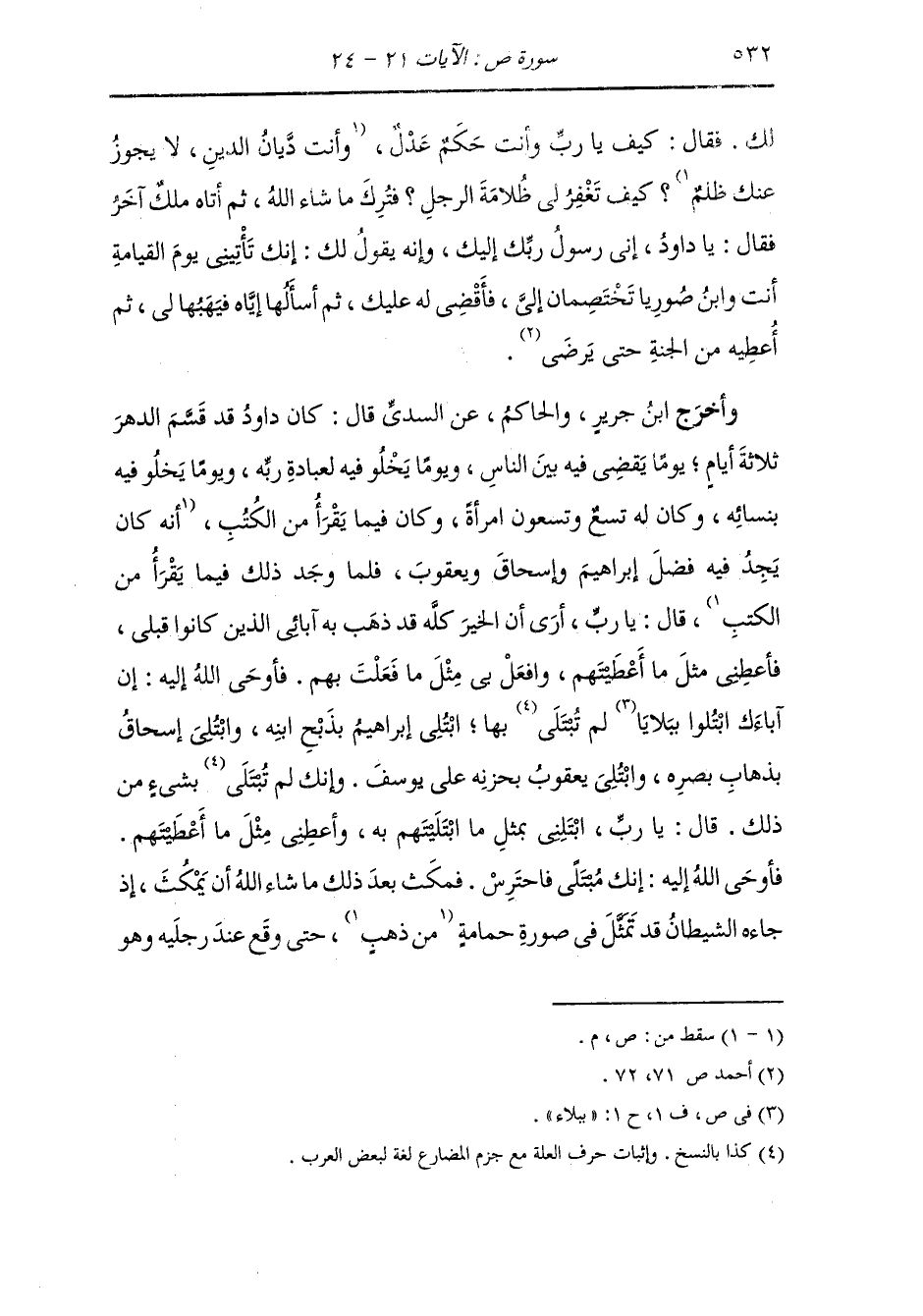 وأخرج أحمد في الزهد عن أبي عمران الجوني رضي الله عنه في قوله {وهل أتاك نبأ الخصم} فجلسا فقال لهما قضاء فقال أحدهما إلى الآخر {أخي له تسع وتسعون نعجة ولي نعجة واحدة فقال أكفلنيها وعزني في الخطاب} فعجب داود عليه السلام وقال {لقد ظلمك بسؤال نعجتك إلى نعاجه} فأغلظ له أحدهما وارتفع ، فعرف داود إنما ذلك بذنبه فسجد فكان أربعين يوما وليلة لا يرفع رأسه إلا إلى صلاة الفريضة حتى يبست وقرحت جبهته وقرحت كفاه وركبتاه فأتاه ملك فقال : يا داود إني رسول ربك إليك وإنه يقول لك ارفع رأسك فقد غفرت