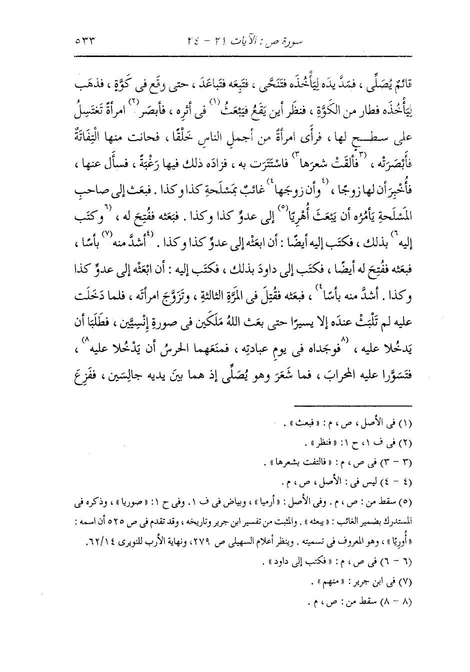 وأخرج ابن جرير والحاكم عن السدي قال : إن داود عليه السلام قد قسم الدهر ثلاثة أيام ، يوما يقضي فيه بين الناس ويوما يخلو فيه لعبادة ربه ويوما يخلو فيه بنسائه وكان له تسع وتسعون امرأة وكان فيما يقرأ من الكتب قال : يا رب أرى الخير قد ذهب به آبائي الذين كانوا قبلي ، فأعطني مثل ما أعطيتهم وافعل بي مثل ما فعلت بهم ، فأوحى الله إليه إن آباءك قد ابتلوا ببلايا لم تبتل بها ، ابتلي