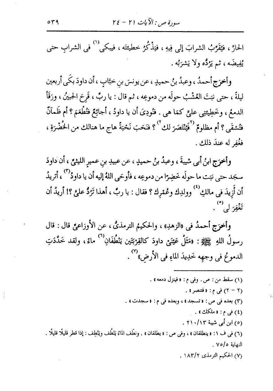 وأخرج عَبد بن حُمَيد عن كعب رضي الله عنه قال : سجد داود نبي الله أربعين يوما وأربعين ليلة لا يرفع رأسه حتى رقأ دمعه ويبس وكان من آخر دعائه وهو ساجد أن قال : يا رب رزقتني العافية فسألتك البلاء فلما ابتليتني لم أصبر فإن تعذبني فأنا أهل ذاك وإن تغفر لي فأنت أهل ذاك ، قال : وإذا جبريل عليه السلام قائم على رأسه قال : يا داود إن الله قد غفر لك فارفع رأسك فلم يلتفت إليه وناجى ربه وهو ساجد فقال : يا رب كيف تغفر لي وأنت الحكم العدل قال إذا كان يوم القيامة دفعتك إلى أوريا ثم استوهبك منه فيهبك لي وأثيبه الجنة قال : يا رب الآن علمت أنك قد غفرت لي فذهب يرفع رأسه فإذا هو يابس لا يستطيع فمسحه جبريل عليه السلام ببعض ريشه فانبسط فأوحى الله تعالى إليه بعد ذلك : يا داود قد أحللت لك امرأة أوريا فتزوجها فولدت له سليمان عليه