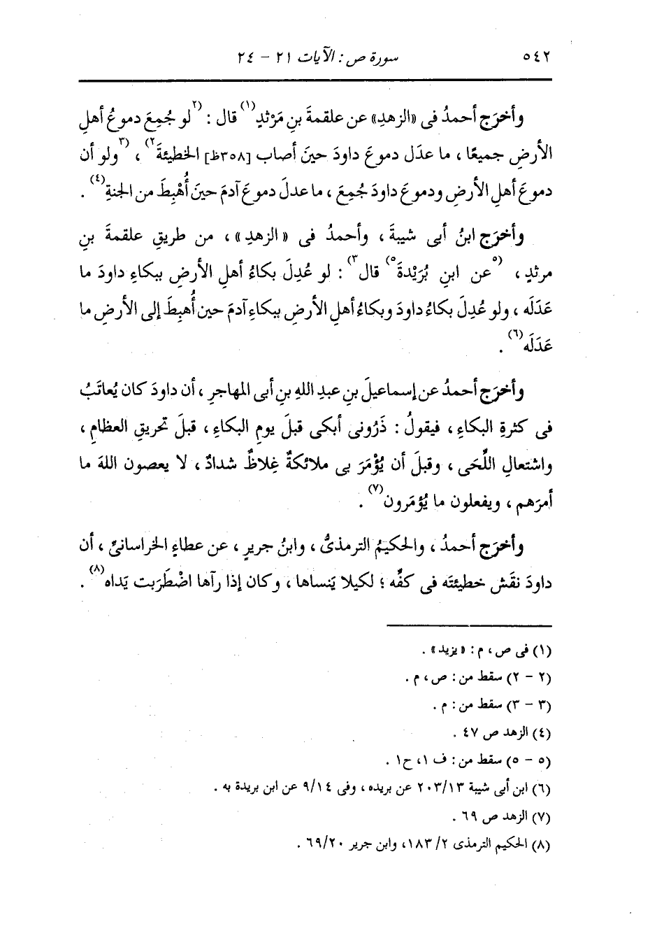 وأخرج عبد الله بن أحمد في زوائد الزهد ، وَابن جَرِير عن مجاهد قال : لما أصاب داود الخطيئة ? {خر ساجدا > ? أربعين ليلة حتى نبت من دموع عينيه من البقل ما غطى رأسه ثم نادى رب قرح الجبين وجمدت العين وداود لم يرجع إليه في خطيئته شيء ، فنودي أجائع فتطعم أم مريض فتشفى أم مظلوم فتنصر فنحب نحبا هاج منه نبت الوادي كله فعند ذلك غفر له وكان يؤتى بالإناء فيشرب فيذكر خطيئته فينتحب فتكاد مفاصله تزول بعضها من بعض فما يشرب بعض الإناء حتى يمتلى ء من دموعه وكان يقال دمعة داود عليه السلام تعدل دمعة الخلائق ودمعة آدم عليه السلام تعدل دمعة داود ودمعة الخلائق فيجيء يوم القيامة مكتوبة بكفه يقرأها يقول : ذنبي ذنبي ، فيقول رب قدمني فيتقدم فلا يأمن ويتأخر فلا يأمن حتى يقول تبارك وتعالى : خذ بقدمي.