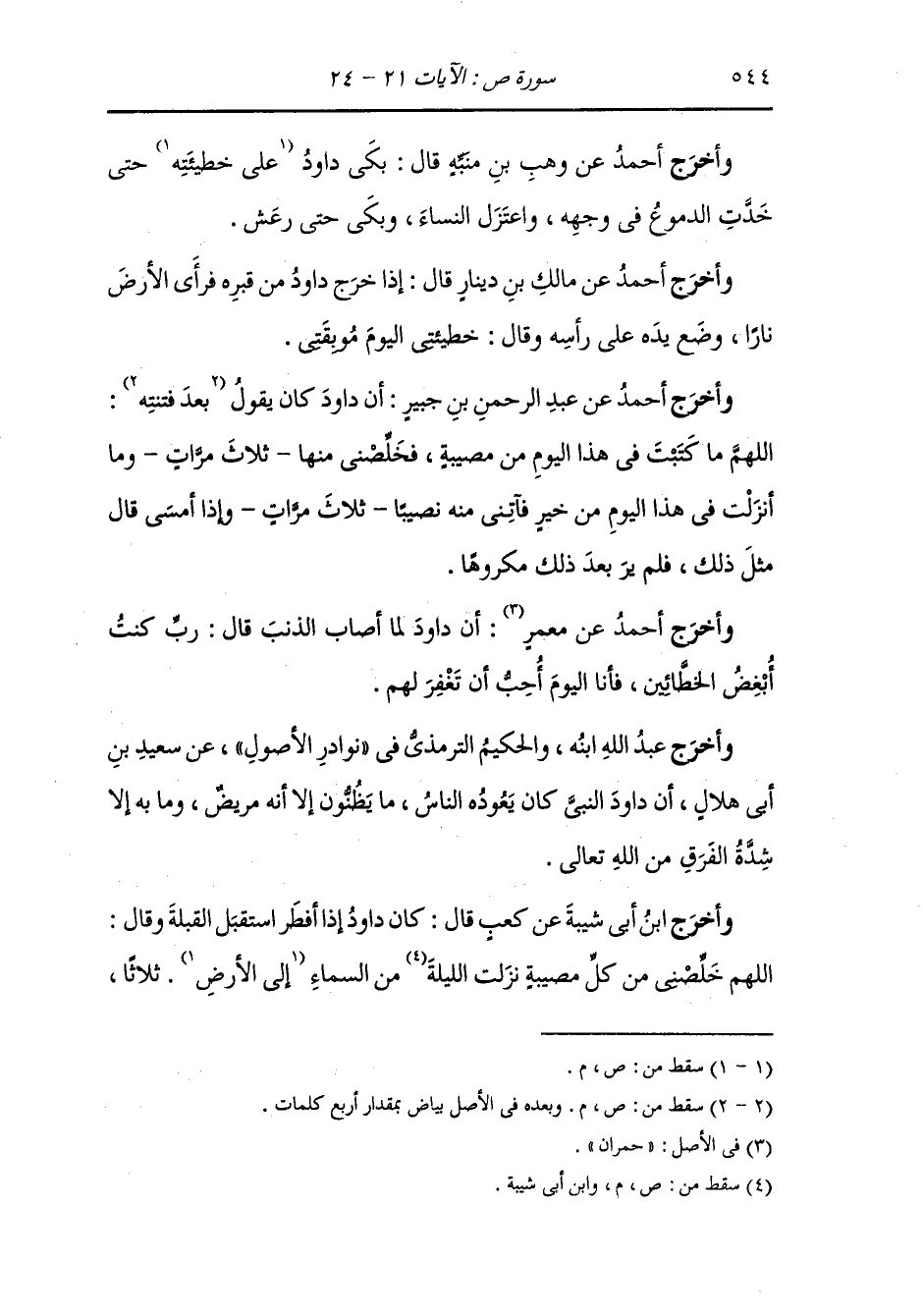 وأخرج أحمد عن عثمان بن أبي العاتكة قال : كان من دعاء داود عليه السلام ، سبحانك إلهي إذا ذكرت خطيئتي ضاقت علي الأرض برحبها وإذا ذكرت رحمتك ارتدت إلي روحي سبحانك إلهي فكلهم [ رآني ] (ما بين قوسين زيادة اقتضاها أتمام المعنى فأثبتها المصحح) عليل بذنبي.