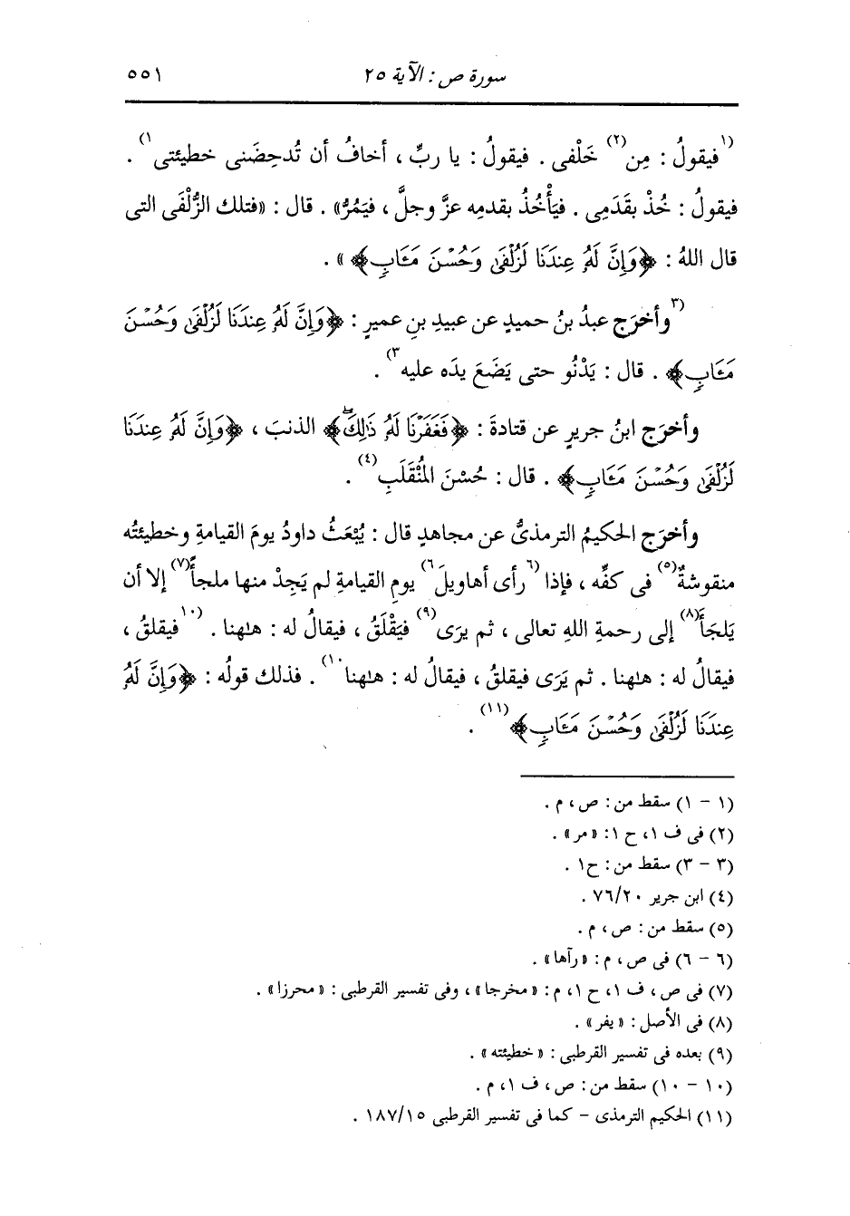 وأخرج سعيد بن منصور ، وَابن المنذر عن محمد بن كعب أنه قال {وإن له عندنا لزلفى} أول الكائن يوم القيامة داود ، وابنه عليهما السلام.