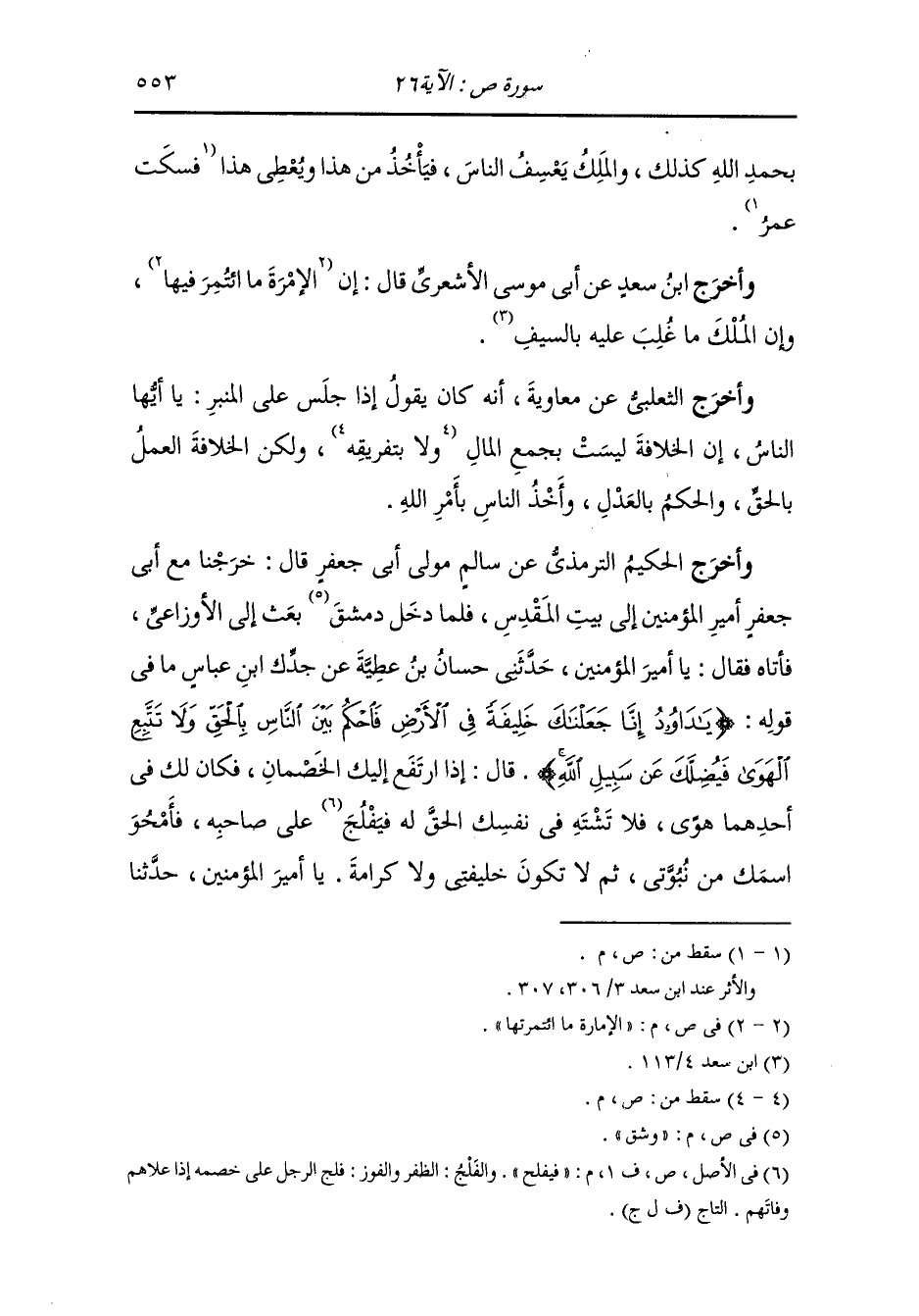 أَخرَج الثعلبي من طريق العوام بن حوشب قال : حدثني رجل من قومي شهد عمر رضي الله عنه أنه سأل طلحة والزبير وكعبا وسلمان ما الخليفة من الملك قال طلحة والزبير : ما ندري فقال سلمان رضي الله عنه : الخليفة الذي يعدل في الرعية ويقسم بينهم بالسوية ويشفق عليهم شفقة الرجل على أهله ويقضي بكتاب الله تعالى ، فقال كعب : ما كنت أحسب أحدا يعرف الخليفة من الملك غيري.