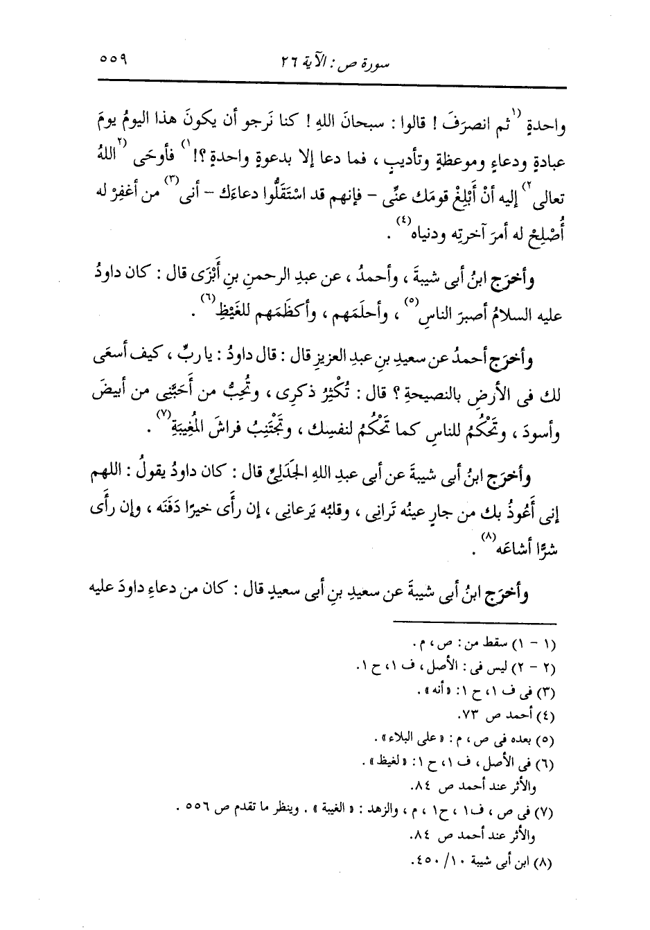 وأخرج أحمد عن سعيد بن عبد العزيز رضي الله عنه قال : قال داود عليه السلام يا رب كيف أسعى لك في الأرض بالنصيحة قال : تكثر ذكري وتحب من أحبني من أبيض وأسود وتحكم للناس كما تحكم لنفسك وتجتنب فراش الغيبة.
