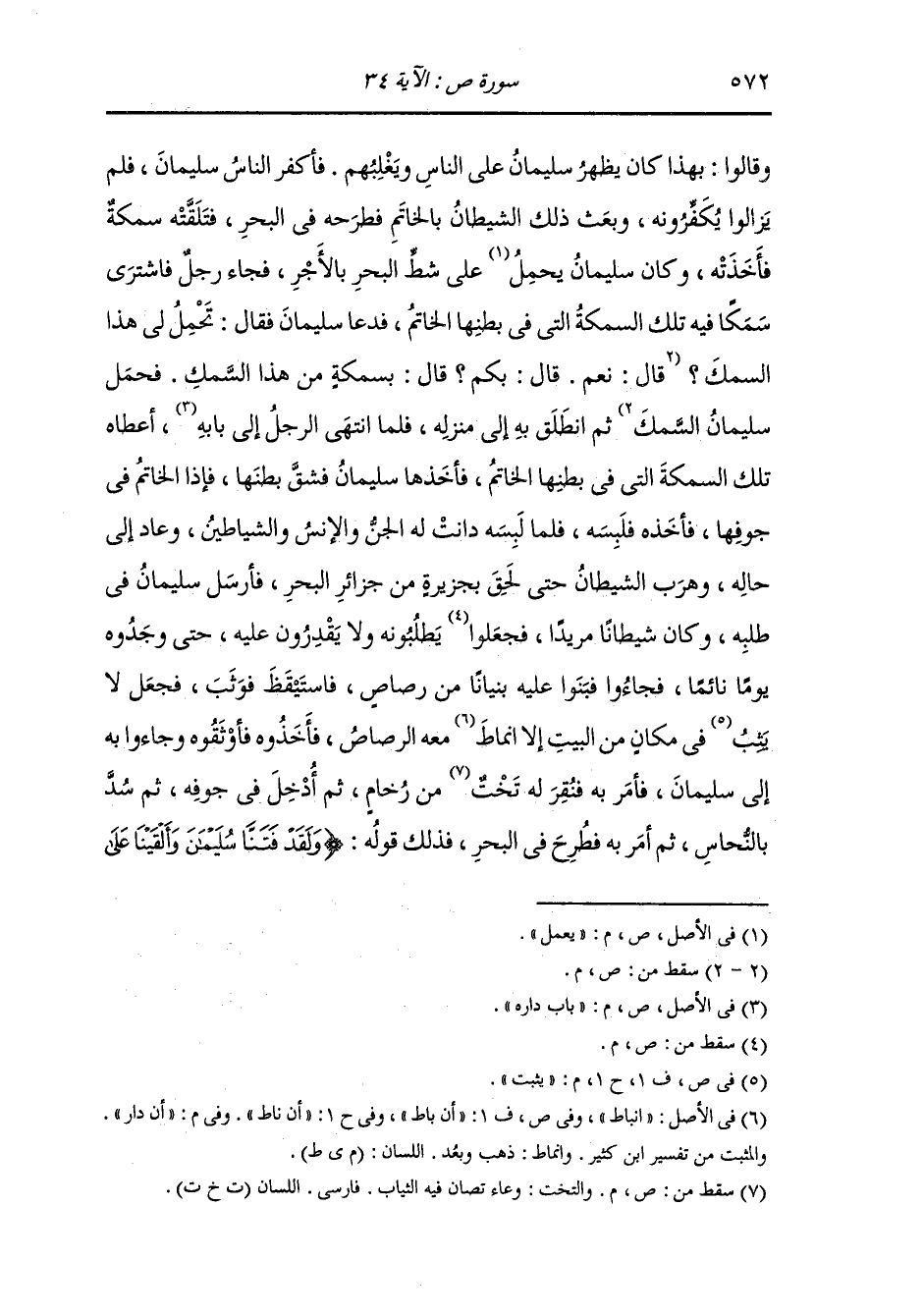 قالوا : بهذا كان يظهر سليمان على الناس ويغلبهم فأكفر الناس سليمان فلم يزالوا يكفرونه وبعث ذلك الشيطان بالخاتم فطرحه في البحر فتلقته سمكة فأخذته وكان سليمان عليه السلام يعمل على شط البحر بالأجر فجاء رجل فاشترى سمكا فيه تلك السمكة التي في بطنها الخاتم فدعا سليمان عليه السلام فقال : تحمل لي هذه السمك ثم انطلق إلى منزله فلما انتهى الرجل إلى باب داره أعطاه تلك السمكة التي في بطنها الخاتم فأخذها سليمان عليه السلام فشق بطنها فإذا الخاتم في جوفها فأخذه فلبسه فلما لبسه دانت له الإنس والجن والشياطين وعاد إلى حاله وهرب الشيطان حتى لحق بجزيرة من جزائر البحر فأرسل سليمان عليه السلام في طلبه وكان شيطانا مريدا يطلبونه ولا يقدرون عليه حتى وجدوه يوما نائما فجاؤا فنقبوا عليه بنيانا من رصاص فاستيقظ فوثب فجعل لا يثبت في مكان من البيت إلا أن دار معه الرصاص فأخذوه وأوثقوه وجاؤا به إلى سليمان عليه السلام فأمر به