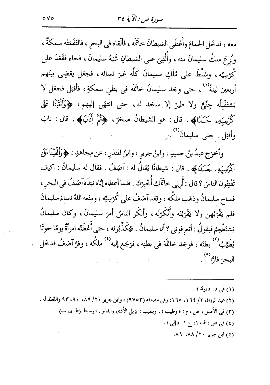وأخرج عَبد بن حُمَيد ، وَابن جَرِير ، وَابن المنذر عن مجاهد رضي الله عنه {وألقينا على كرسيه جسدا} قال : شيطانا يقال له آصف ، فقال له سليمان : كيف تفتنون الناس قال أرني خاتمك أخبرك ، فلما أعطاه إياه نبذه آصف في البحر فساح سليمان عليه السلام وذهب ملكه وقعد آصف على كرسيه ومنعه الله تعالى نساء سليمان عليه السلام فلم يقربهن ولا يقربنه وأنكرنه وأنكر الناس أمر سليمان عليه السلام ، وكان سليمان عليه السلام يستطعم فيقول : أتعرفوني أنا سليمان فيكذبوه حتى أعطته امرأة يوما حوتا وطيب بطنه فوجد خاتمه في بطنه فرجع إليه ملكه وفر الشيطان فدخل البحر فارا