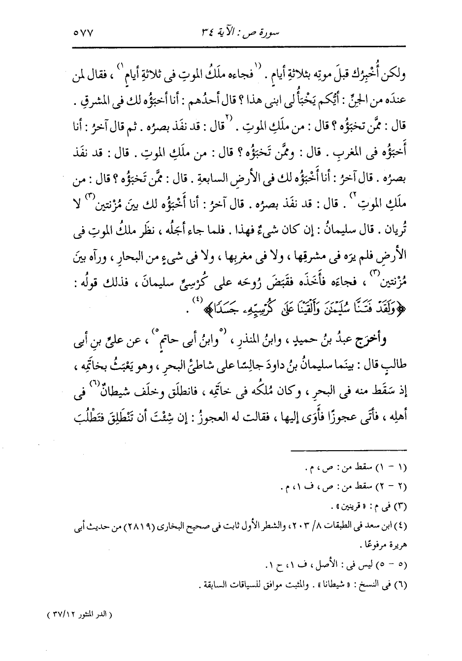 ولكن أخبرك قبل موته بثلاثة أيام ، قال لمن عنده من الجن : أيكم يخبى ء لي ابني هذا قال أحدهم أنا أخبؤه لك في المشرق قال : ممن تخبؤه قال : من ملك الموت ، قال يبصره ، قال آخر : أنا أخبؤه لك بين قرينين لا يريان ، قال سليمان عليه السلام إن كان شيء فهذا ، فلما جاء أجله نظر ملك الموت في الأرض فلم يره في مشرقها ولا في مغربها ولا شيء من البحار ورآه بين قرينين فجاءه فأخذه فقبض روحه على كرسي سليمان ، فذلك قوله {ولقد فتنا سليمان} وهو قول الله {وألقينا على كرسيه جسدا}.