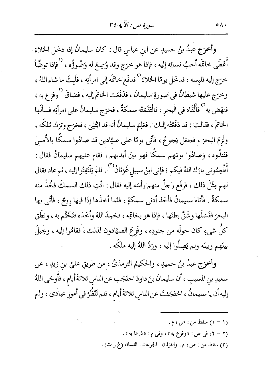 وأخرج عَبد بن حُمَيد عن ابن عباس رضي الله عنه ما قال : كان سليمان عليه السلام إذا دخل الخلاء أعطى خاتمه أحب نسائه إليه فإذا هو قد خرج وقد وضع له وضوء فدفع خاتمه إلى امرأته فلبث ما شاء الله ، وخرج عليها شيطان في صورة سليمان فدفعت الخاتم إليه فضاق درعا به فألقاه في البحر فالتقمته سمكة فخرج سليمان عليه السلام على امرأته فسألها