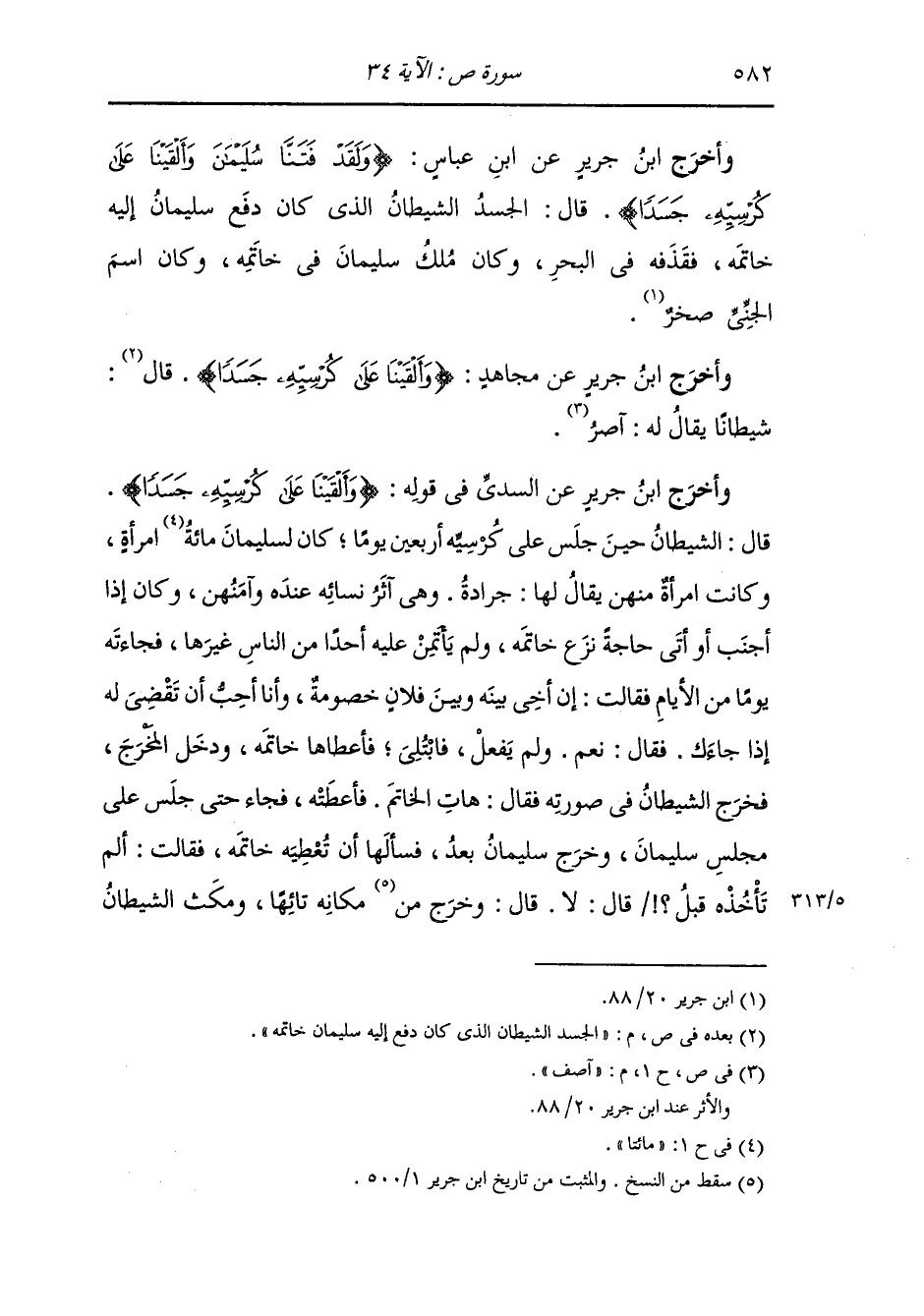وأخرج ابن جرير عن ابن عباس رضي الله عنهما {ولقد فتنا سليمان وألقينا على كرسيه جسدا} قال : الجسد الشيطان الذي كان دفع سليمان عليه السلام إليه خاتمه فقذفه في البحر وكان ملك سليمان عليه السلام في خاتمه وكان اسم الجني صخرا.