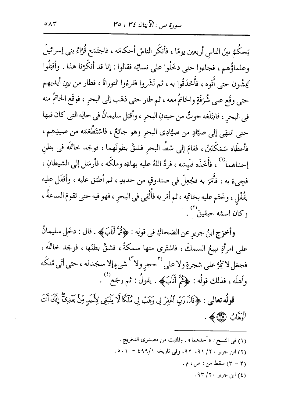 وأخرج ابن جرير عن الضحاك رضي الله عنه في قوله {ثم أناب} قال : دخل سليمان على امرأة تبيع السمك فاشترى منها سمكة فشق بطنها فوجد خاتمه فجعل لا يمر على شجرة ولا على شيء إلا سجد له حتى أتى ملكه وأهله ، فذلك قوله {ثم أناب} يقول : ثم رجع.