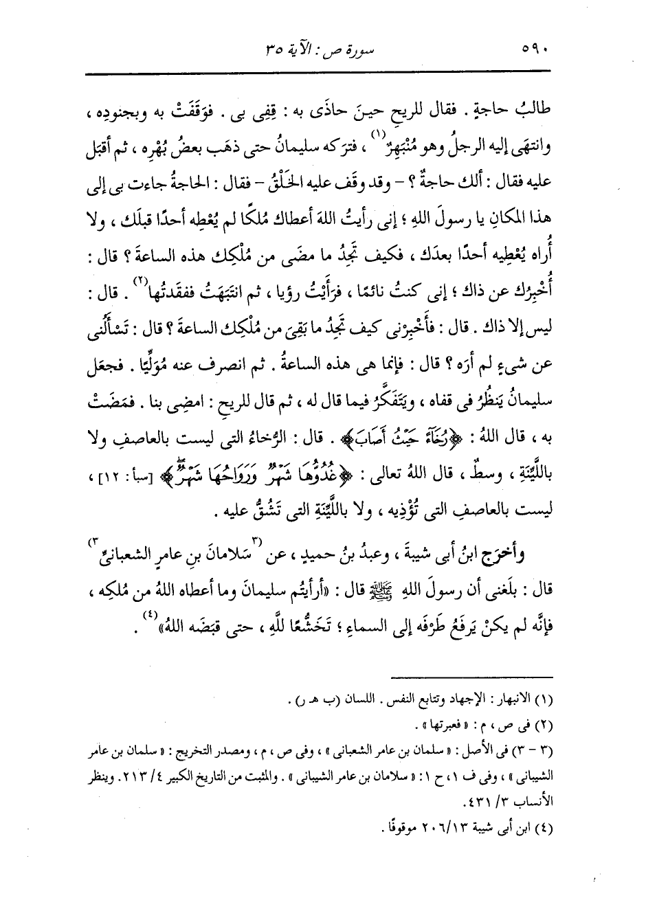 طالب حاجة فقال للريح حين وقفت به : قفي ، فوقفت به وبجنود حتى انتهى إليه الرجل وهو منبهر فتركه سليمان حتى ذهب بهره ثم أقبل عليه فقال ألك حاجة وقد وقف عليه الخلق فقال : الحاجة جاءت بي إلى هذا المكان يا رسول الله ، إني رأيت الله أعطاك ملكا لم يعطه أحدا قبلك ولا أراه يعطيه أحدا بعدك فكيف تجد ما مضى من ملكك هذه الساعة قال : أخبرك عن ذاك إني كنت نائما فرأيت رؤيا ثم تنبهت فعبرتها قال : ليس إلا ذاك قال : فأخبرني كيف تجد ما بقي من ملكك الساعة قال : تسألني عن شيء لم أره قال : فإنما هي هذه الساعة ثم انصرف عنه موليا.