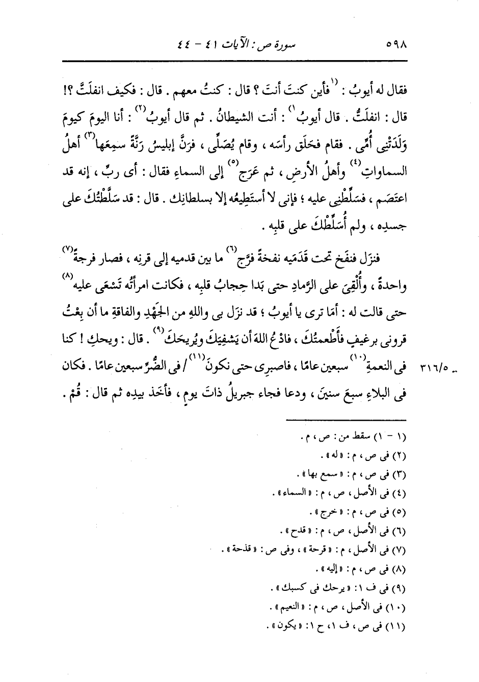 فقال له أيوب أنت الشيطان ثم قال له أنا اليوم كيوم ولدتني أمي فقام فحلق رأسه وقام يصلي فرن إبليس رنة سمع بها أهل السماء وأهل الأرض ثم خرج إلى السماء فقال : أي رب إنه قد اعتصم فسلطني عليه فإني لا أستطيعه إلا بسلطانك قال : قد سلطتك على جسده ولم أسلطك على قلبه ، فنزل فنفخ تحت قدمه نفخة قرح ما بين قدميه إلى قرنه فصار قرحة واحدة وألقي على الرماد حتى بدا حجاب قلبه فكانت امرأته تسعى إليه حتى قالت له : أما ترى يا أيوب نزل بي والله من الجهد والفاقة ما أن بعت قروني برغيف ، فأطعمك فأدع الله أن يشفيك ويريحك قال : ويحك ، كنا في النعيم سبعين عاما فاصبري حتى نكون في الضر سبعين عاما فكان في البلاء سبع سنين ودعا