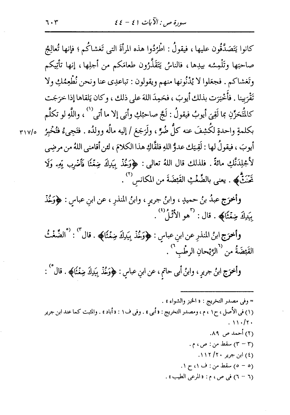 وأخرج عَبد بن حُمَيد ، وَابن جَرِير ، وَابن المنذر عن ابن عباس رضي الله عنهما {وخذ بيدك ضغثا} قال : الضغث القبضة من المرعى الطيب.