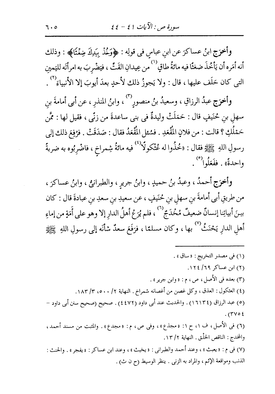 وأخرج عبد الرزاق وسعيد بن منصور ، وَابن جَرِير ، وَابن المنذر عن أبي أمامة بن سهل بن حنيف قال : حملت وليدة في بني ساعدة من زنا فقيل لها : ممن حملك قالت : من فلان المقعد فسأل المقعد فقال صدقت فرفع ذلك إلى رسول الله صلى الله عليه وسلم فقال : خذوا له عثكولا فيه مائة شمراخ فاضربوه به ضربة واحدة ففعلوا.