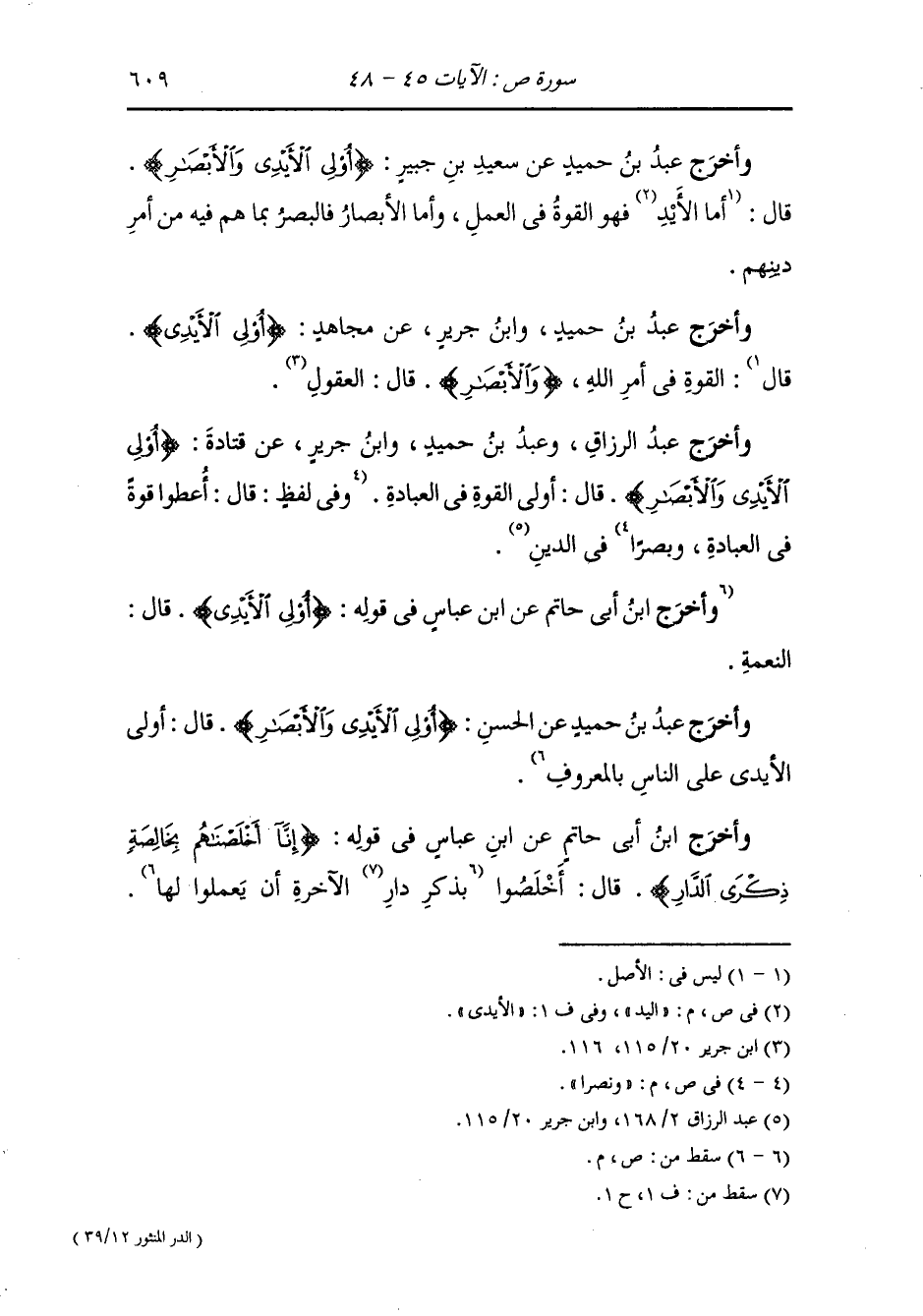 وَأخرَج عَبد بن حُمَيد عن الحسن : (أولي الأيدي والأبصار) قال : أولي الأيدي على الناس بالمعروف.