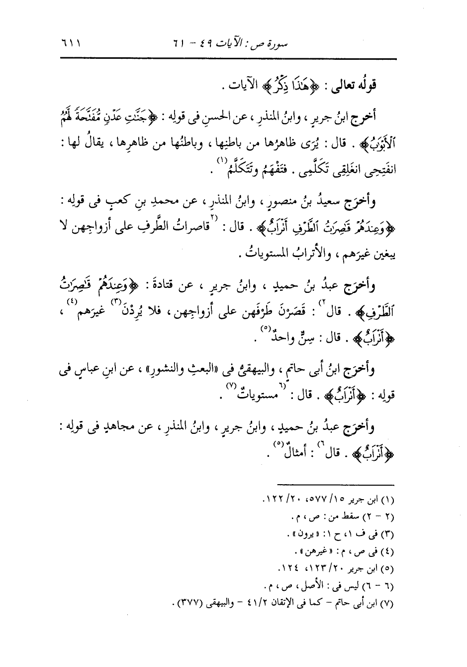 وأخرج سعيد بن منصور ، وَابن المنذر عن محمد بن كعب في قوله {وعندهم قاصرات الطرف أتراب} قال : قصرن طرفهن على أزواجهن فلا يردن غيرهن {أتراب} قال : سن واحد.