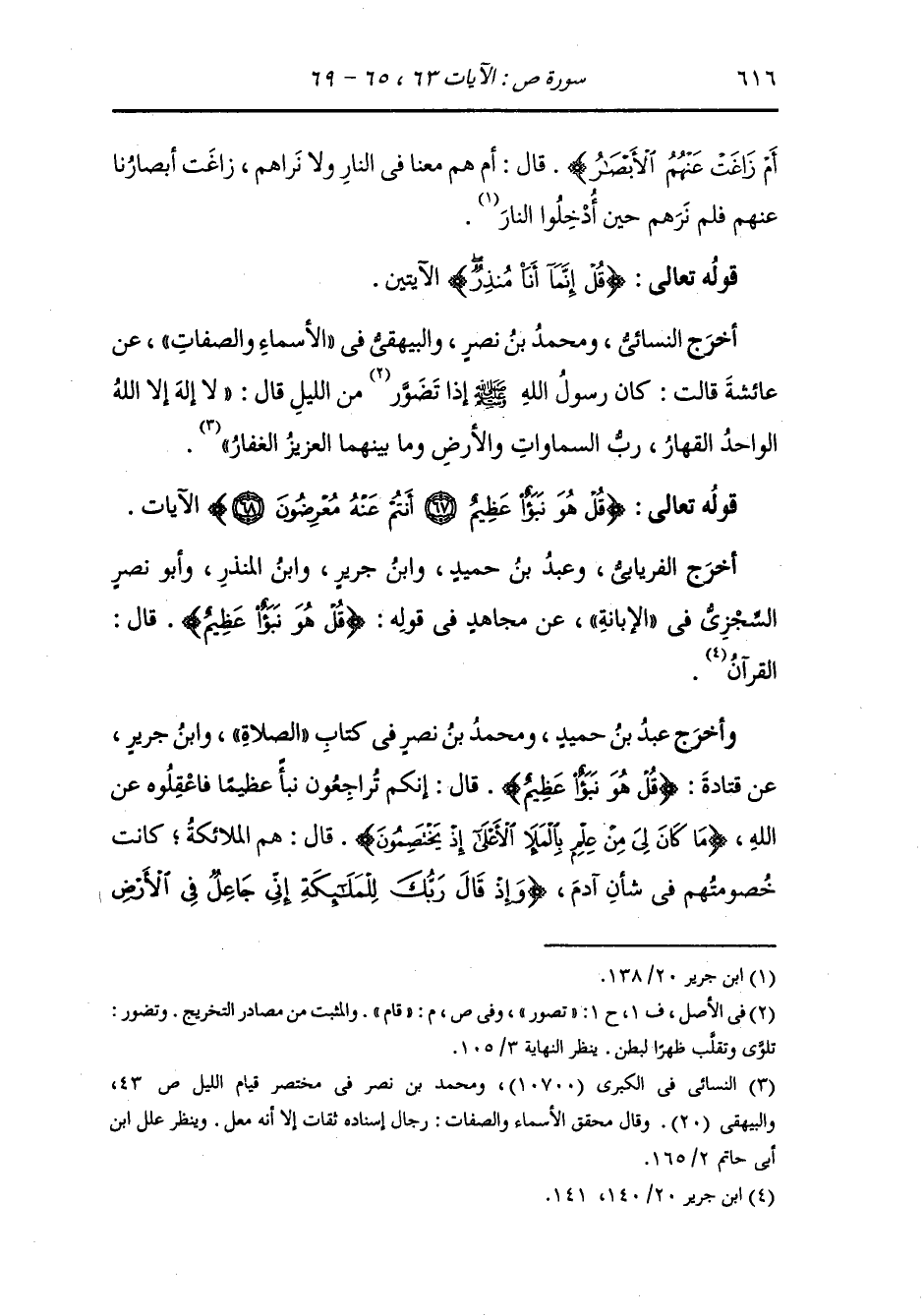 وأخرج عَبد بن حُمَيد في الإبانة ومحمد بن نصر في كتاب الصلاة ، وَابن جَرِير عن قتادة {قل هو نبأ عظيم} قال : إنكم تراجعون نبأ عظيما فأعقلوه عن الله {ما كان لي من علم بالملإ الأعلى إذ يختصمون} قال : هم الملائكة عليهم السلام كانت خصومتهم في شأن آدم عليه السلام (إذ قال ربك للملائكة إني جاعل في الأرض