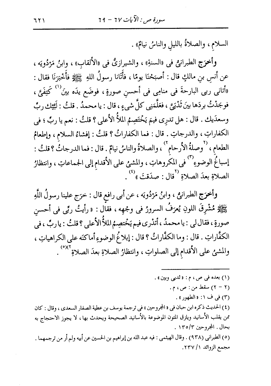 وأخرج الطبراني في السنة والشيرازي في الألقاب ، وَابن مردويه عن أنس رضي الله عنه قال : أصبحنا يوما فأتانا رسول الله صلى الله عليه وسلم فأخبرنا فقال : أتاني ربي البارحة في منامي في أحسن صورة فوضع يده بين ثدي وبين كتفي فوجدت بردها بين ثديي فعلمني كل شيء قال : يا محمد قلت : لبيك رب وسعديك قال : هل تدري فيم يختصم الملأ الأعلى قلت : نعم يا رب في الكفارات والدرجات قال : فما الكفارات قلت : إفشاء السلام وإطعام الكعام والصلاة والناس نيام ، قال : فما الدرجات قلت : إسباغ الوضوء في المكروهات والمشي على الأقدام إلى الجماعات وانتظار الصلاة بعد الصلاة.