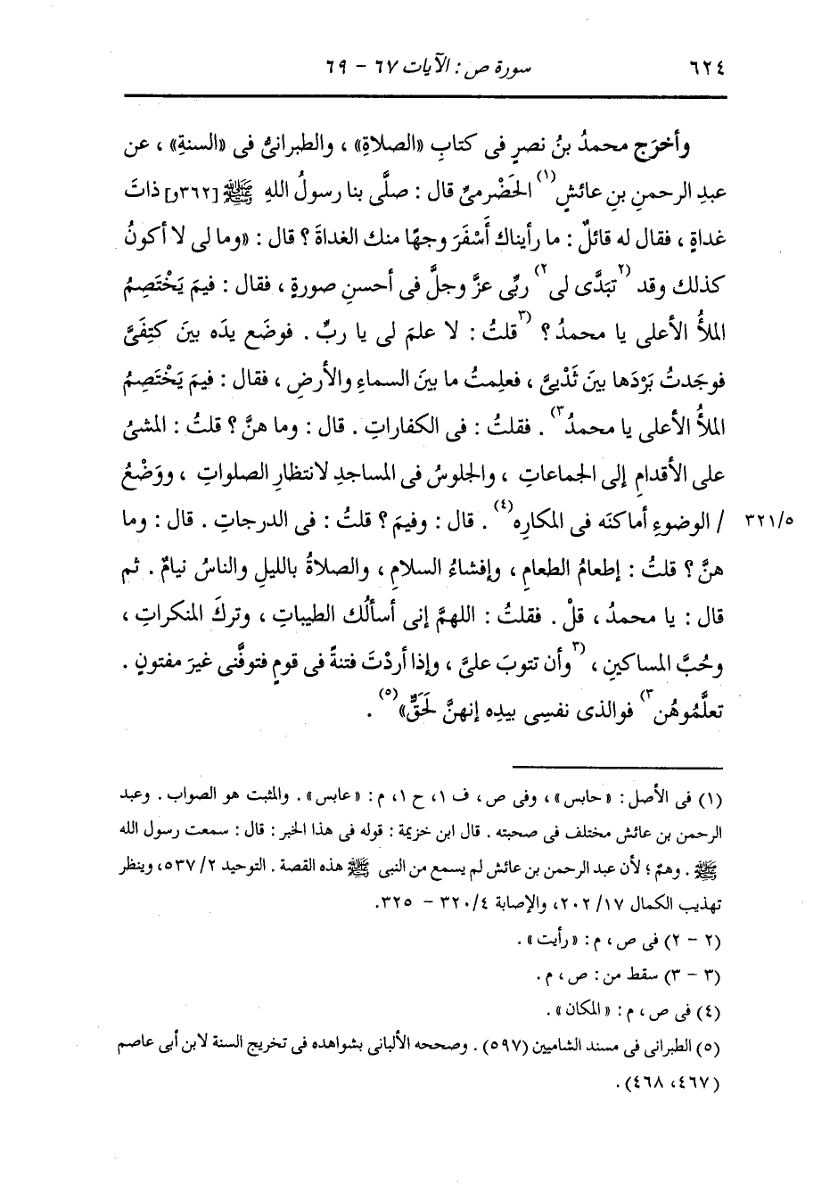 وأخرج محمد بن نصر في كتاب الصلاة والطبراني في السنة عن عبد الرحمن بن عابس الحضرمي رضي الله عنه قال : صلى بنا رسول الله صلى الله عليه وسلم ذات غداة فقال له قائل : ما رأيناك أسفر وجها منك الغداة قال : وما لي لا أكون كذلك وقد رأيت ربي عز وجل في أحسن صورة فقال : فيم يختصم الملأ الأعلى يا محمد فقلت : في الكفارات ، قال : وما هن قلت : المشي على الأقدام إلى الجماعات والجلوس في المساجد لانتظار الصلوات ووضع الوضوء أماكنه في المكان قال : وفيم قلت : في الدرجات ، قال : وما هن قال : إطعام الطعام وإفشاء السلام والصلاة بالليل والناس نيام ، ثم قال : يا محمد قل اللهم إني أسألك الطيبات وترك المنكرات وحب المساكين فو الذي نفسي بيده إنهن حق.