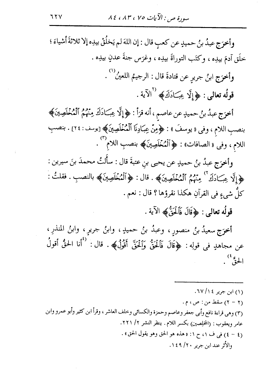 وأخرج ابن جرير عن قتادة قال : الرجيم اللعين ، قوله {إلا عبادك منهم المخلصين} قال : المخلصين بالنصب ، فقلت كل شيء في القرآن هكذا نقرأوها قال : نعم.
