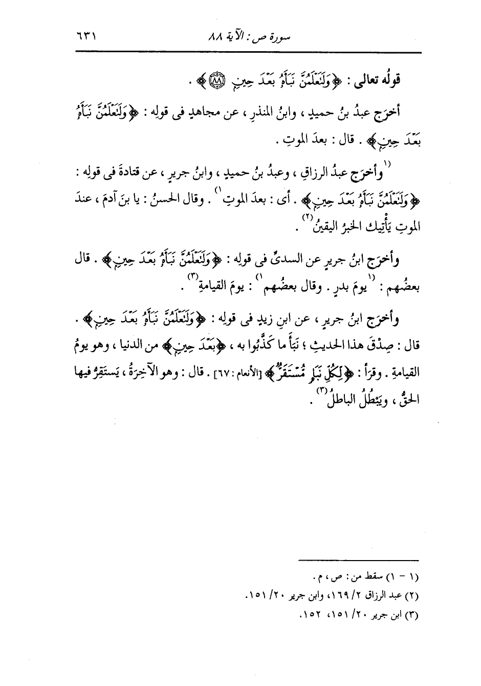 وأخرج ابن جرير عن ابن زيد رضي الله عنه في قوله {ولتعلمن نبأه} قال : صدق هذا الحديث نبأ ما كذبوا به بعد حين من الدنيا وهو يوم القيامة وقرأ (لكل نبأ مستقر) (الأنعام الآية 67) قال : وهو الآخرة يستقر فيها الحق ويبطل فيها الباطل.
