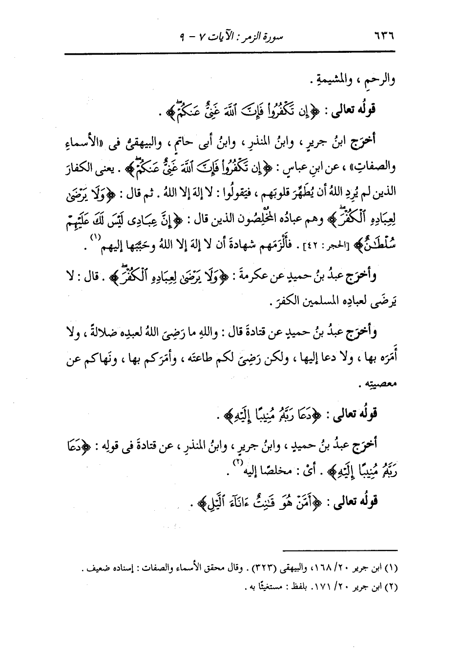 أخرج ابن جرير ، وَابن المنذر ، وَابن أبي حاتم والبيهقي في الأسماء والصفات عن ابن عباس رضي الله عنهما {إن تكفروا فإن الله غني عنكم} يعني الكفار الذين لم يرد الله أن يطهر قلوبهم فيقولون لا إله إلا الله ، ثم قال {ولا يرضى لعباده الكفر} وهم عباده المخلصون الذين قال (إن عبادي ليس لك عليهم سلطان) (الحجر 42) فألزمهم شهادة أن لا إله إلا الله وحببها إليهم.