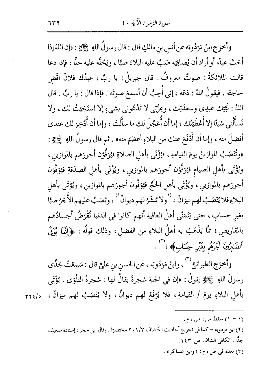 وأخرج ابن مردويه عن أنس بن مالك رضي الله عنه قال : قال رسول الله صلى الله عليه وسلم : إن الله إذا أحب عبدا أو أراد أن يصافيه صب عليه البلاء صبا ويحثه عليه حثا فإذا دعا قالت الملائكة عليهم السلام : صوت معروف قال جبريل عليه السلام : يا رب عبدك فلان اقض حاجته ، فيقول الله تعالى : دعه إني أحب أن أسمع صوته ، فإذا قال يا رب ، ، قال الله تعالى لبيك عبدي وسعديك ، وعزتي لا تدعوني بشيء إلا استجبت لك ولا تسألني شيئا إلا أعطيتك ، إما أن أعجل لك ما سألت وإما أن أدخر لك عندي أفضل منه وإما أن أدفع عنك من البلاء أعظم منه ، ثم قال رسول الله صلى الله عليه وسلم : وتنصب الموازين يوم القيامة فيأتون بأهل الصلاة فيوفون أجورهم بالموازين ويؤتى بأهل الصيام فيوفون أجورهم بالموازين ويؤتى بأهل الصدقة فيوفون أجورهم بالموازين ويؤتى بأهل الحج فيوفون أجورهم بالموازين ويؤتى بأهل البلاء فلا ينصب لهم ميزان ويصب عليهم الأجر صبا بغير حساب حتى يتمنى أهل العافية أنهم كانوا في الدنيا تقرض أجسادهم بالمقاريض مما يذهب به أهل البلاء من الفضل ، وذلك قوله {إنما يوفى الصابرون أجرهم بغير حساب}.