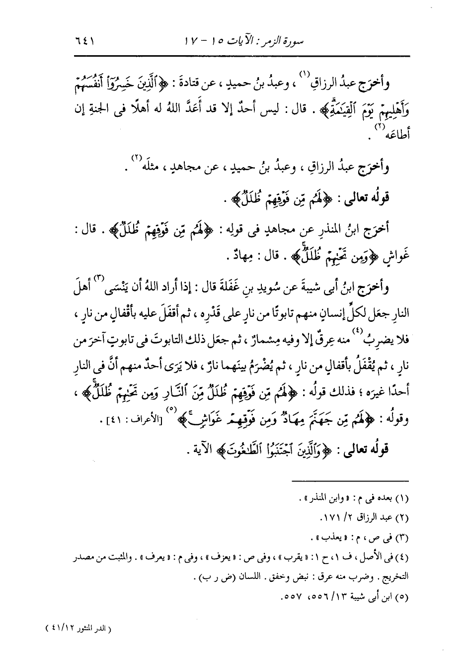 أَخْرَج ابن المنذر عن مجاهد في قوله {لهم من فوقهم ظلل} قال : غواش {ومن تحتهم ظلل} قال : مهاد.