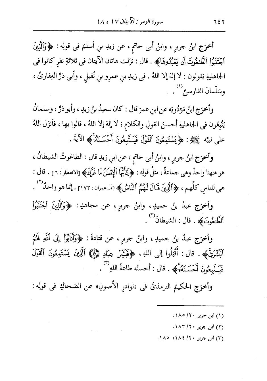 أخرج ابن جرير ، وَابن أبي حاتم عن زيد بن أسلم في قوله {والذين اجتنبوا الطاغوت أن يعبدوها} قال : نزلت هاتان الآيتان في ثلاثة نفر كانوا في الجاهلية يقولون : لا إله إلا الله ، في زيد بن عمرو بن نفيل وأبي ذر الغفاري وسلمان الفارسي.
