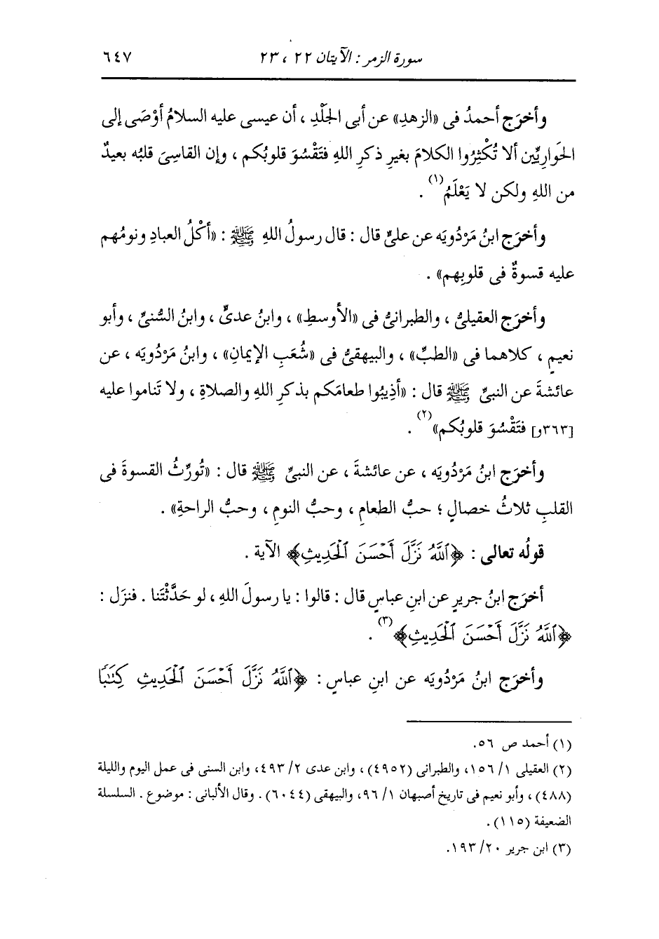 وأخرج ابن مردويه عن عائشة رضي الله عنها عن النَّبِيّ صلى الله عليه وسلم قال : يورث القسوة في القلب ثلاث خصال ، حب الطعام وحب النوم وحب الراحة ، والله أعلم.