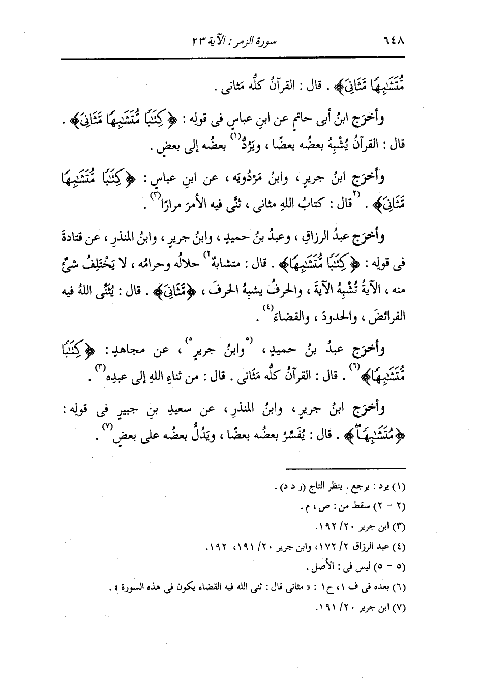 وأخرج ابن جرير ، وَابن مردويه عن ابن عباس رضي الله عنهما {كتابا متشابها} حلاله وحرامه لا يختلف شيء منه ، الآية تشبه الآية والحرف يشبه الحرف {مثاني} قال : يثني الله فيه الفرائض والحدود والقضاء.