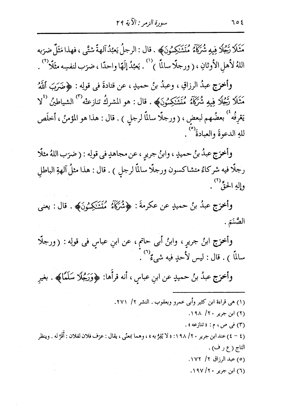 وأخرج عبد الرزاق ، وعَبد بن حُمَيد عن قتادة رضي الله عنه في قوله {ضرب الله مثلا رجلا فيه شركاء متشاكسون} قال : هو المشرك تنازعه الشياطين لا يعرفه بعضهم لبعض {ورجلا سلما لرجل} قال : هذا المؤمن أخلص لله الدعوة والعبادة.