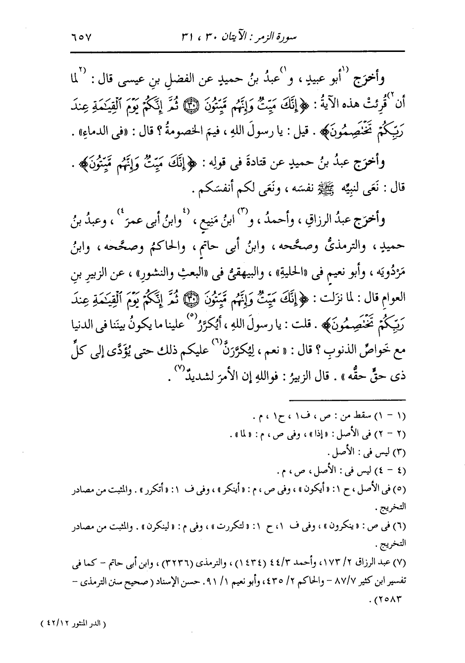 وأخرج عبد الرزاق واحمد ، وَابن منيع ، وعَبد بن حُمَيد والترمذي وصححه ، وَابن أبي حاتم والحاكم وصححه ، وَابن مردويه وأبو نعيم في الحلية والبيهقي في البعث والنشور عن الزبير بن العوام رضي الله عنه قال : لما نزلت {إنك ميت وإنهم ميتون ثم إنكم يوم القيامة عند ربكم تختصمون} قلت : يا رسول الله أينكر علينا ما يكون بيننا في الدنيا مع خواص الذنوب قال : نعم ، لينكرن ذلك عليكم حتى يؤدى إلى كل ذي حق حقه ، قال الزبير رضي الله عنه : فو الله إن الأمر لشديد.