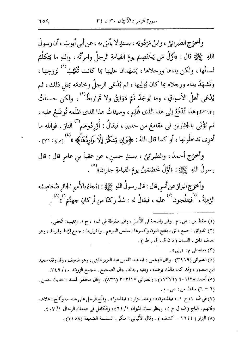 وأخرج الطبراني ، وَابن مردويه بسند لا بأس به عن أبي أيوب رضي الله عنه ، أن رسول الله صلى الله عليه وسلم قال : أول من يختصم يوم القيامة الرجل وامرأته ، والله ما يتكلم لسانها ولكن يداها ورجلاها يشهدان عليها بما كانت لزوجها وتشهد يداه ورجلاه بما كان يوليها ، ثم يدعى الرجل وخادمه بمثل ذلك ثم يدعى أهل الأسواق وما يوجد ثم دوانق ولا قراريط ولكن حسنات هذا تدفع إلى هذا الذي ظلم وسيئآت هذا الذي ظلمه توضع عليه ثم يؤتى بالجبارين في مقامع من حديد فيقال : أوردوهم إلى النار ، فو الله ما أدري يدخلونها أو كما قال الله (وإن منكم إلا واردها) (مريم الآية 71).