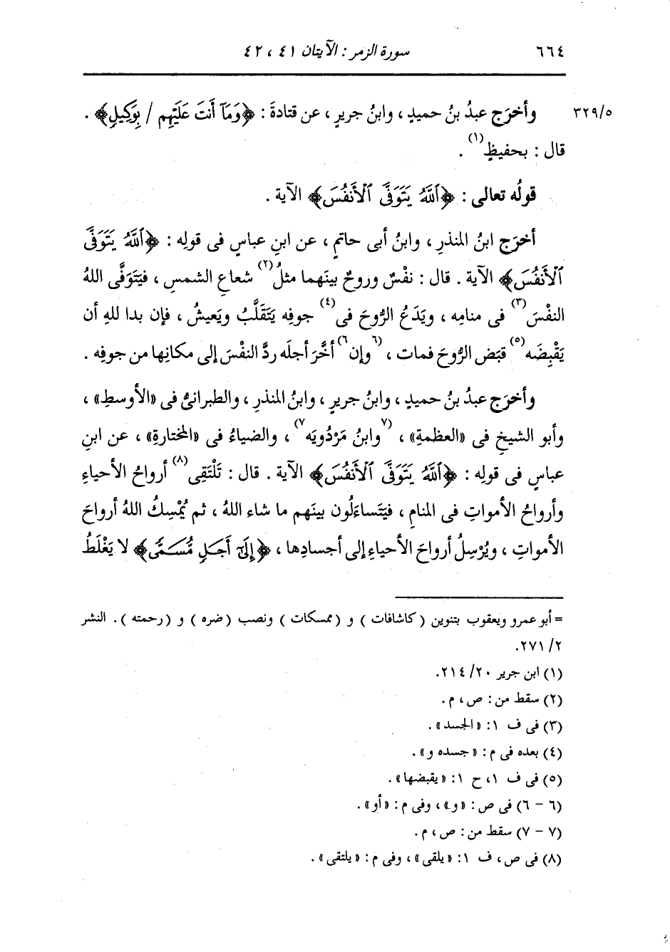 أَخْرَج ابن المنذر ، وَابن أبي حاتم عن ابن عباس في قوله {الله يتوفى الأنفس} الآية ، قال : نفس وروح بينهما شعاع الشمس فيتوفى الله النفس في منامه ويدع الروح في جسده وجوفه يتقلب ويعيش فإن بدا لله أن يقبضه قبض الروح فمات أو أخر أجله رد النفس إلى مكانها من جوفه.