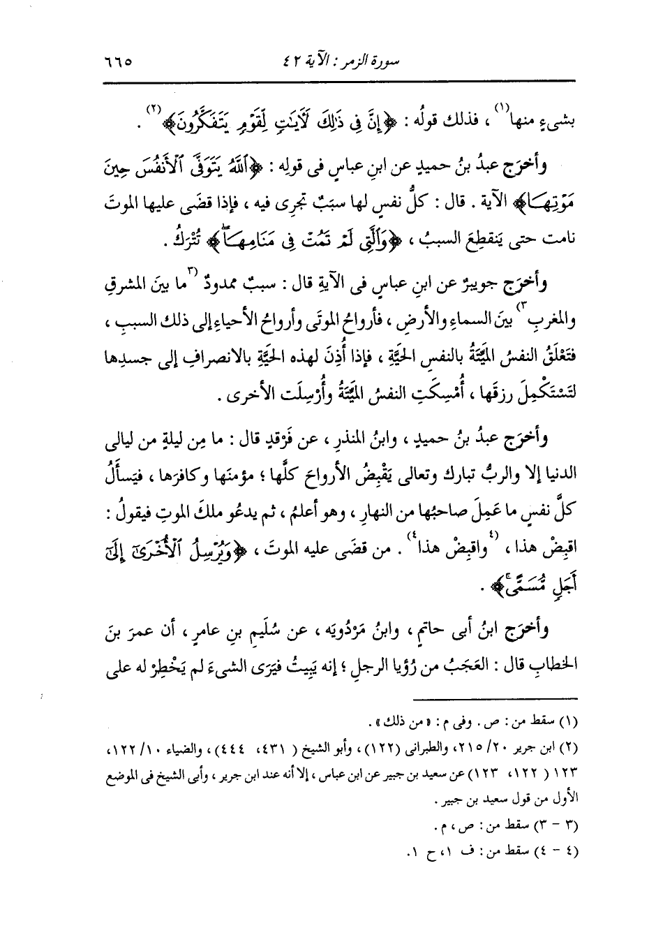 وأخرج عَبد بن حُمَيد عن ابن عباس في قوله {الله يتوفى الأنفس حين موتها} قال : كل نفس لها سبب تجري فيه فإذا قضى عليها الموت نامت حتى ينقطع السبب {والتي لم تمت} تترك.