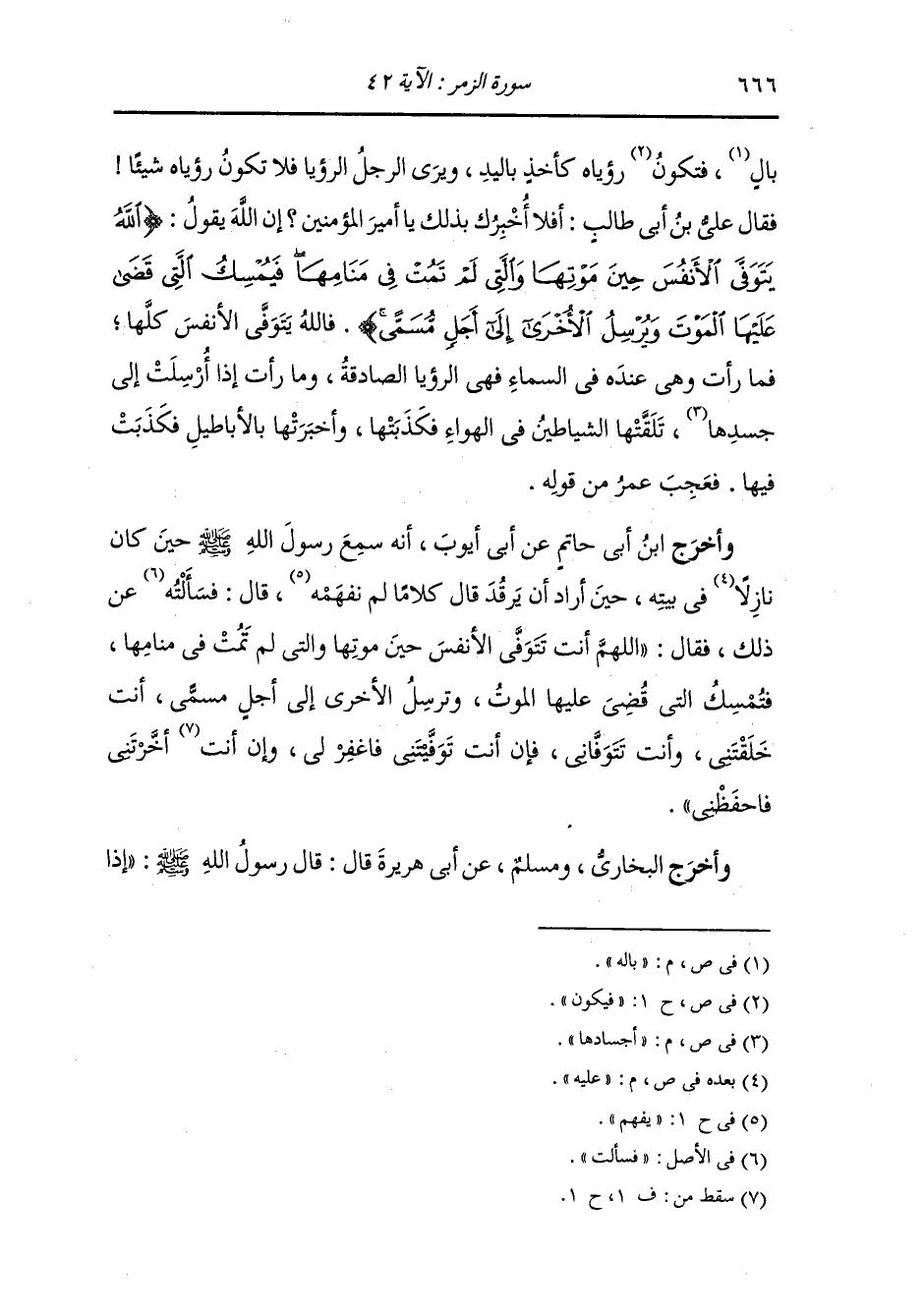 وأخرج ابن أبي حاتم عن أبي أيوب ، أنه سمع رسول الله صلى الله عليه وسلم حين كان نازلا عليه في بيته حين أراد أن يرقد قال كلاما لم نفهمه قال : فسألته عن ذلك فقال اللهم أنت تتوفى الأنفس حين موتها والتي لم تمت في منامها فتمسك التي قضي عليها الموت وترسل الأخرى إلى أجل مسمى أنت خلقتني وأنت تتوفاني فإن أنت توفيتني فاغفر لي وأن أنت أخرتني فاحفظني.