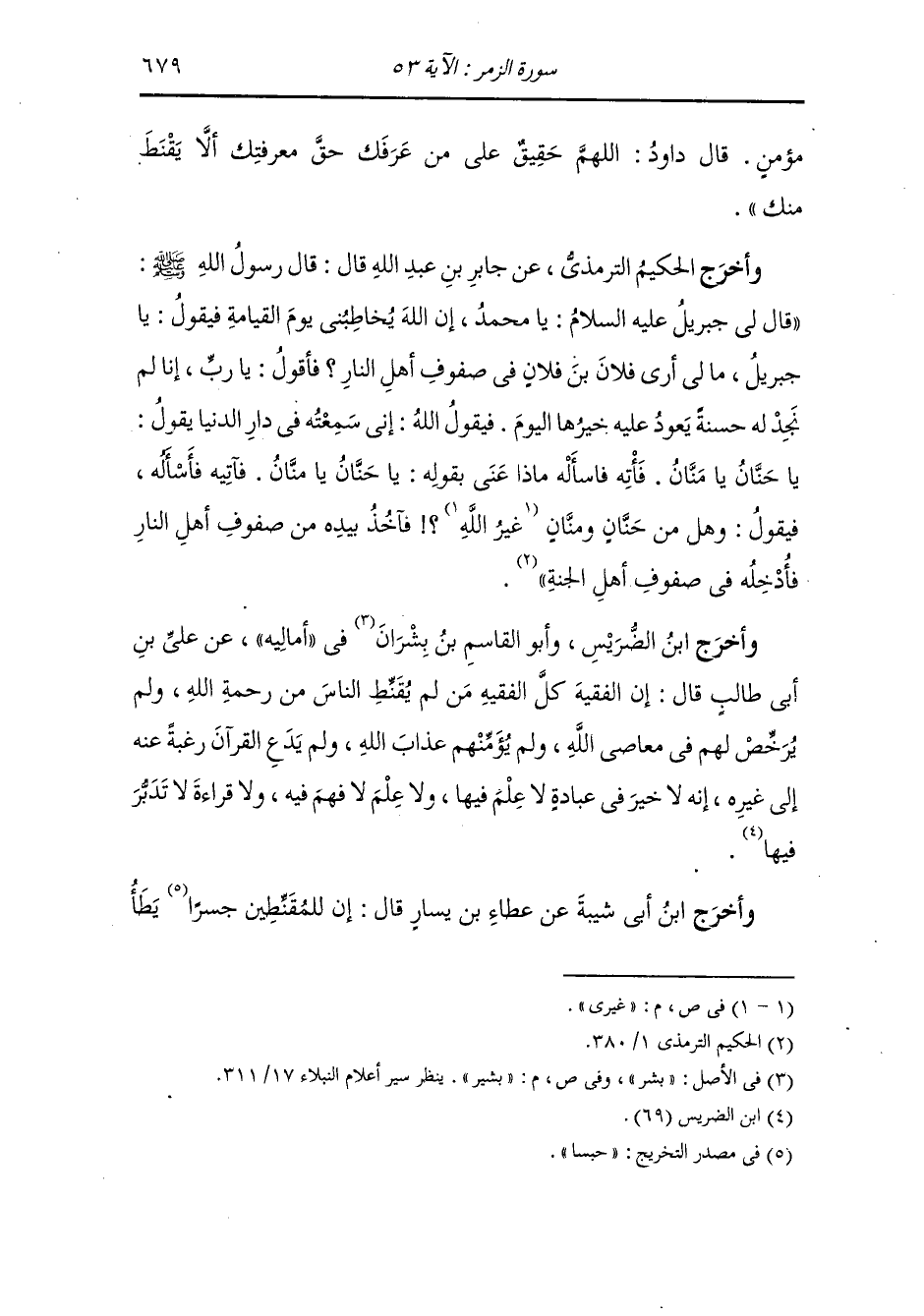 وأخرج الحكيم الترمذي ، عَن جَابر بن عبد الله رضي الله عنه قال : قال رسول الله صلى الله عليه وسلم : قال لي جبريل عليه السلام : يا محمد إن الله يخاطبني يوم القيامة فيقول : يا جبريل ما لي أرى فلان بن فلان في صفوف أهل النار فأقول : يا رب أنا لم نجد له حسنة يعود عليه خيرها اليوم ، فيقول الله : إني سمعته في دار الدنيا يقول : يا حنان يا منان فأته فاسأله فيقول وهل من حنان ومنان غيري فآخذ بيده من صفوف أهل النار فأدخله في صفوف أهل الجنة.