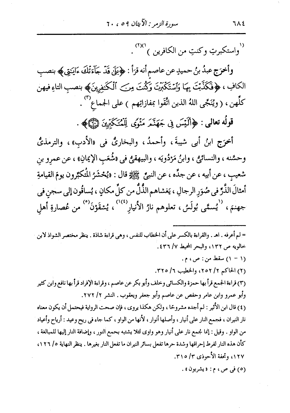 وأخرج عَبد بن حُمَيد عن عاصم أنه قرأ بلى قد جاءتك آياتي بنصب الكاف فكذبت بها واستكبرت وكنت من الكافرين بنصب التاء فيهن كلهن وينجي الله الذين اتقوا بمفازاتهم على الجماع.