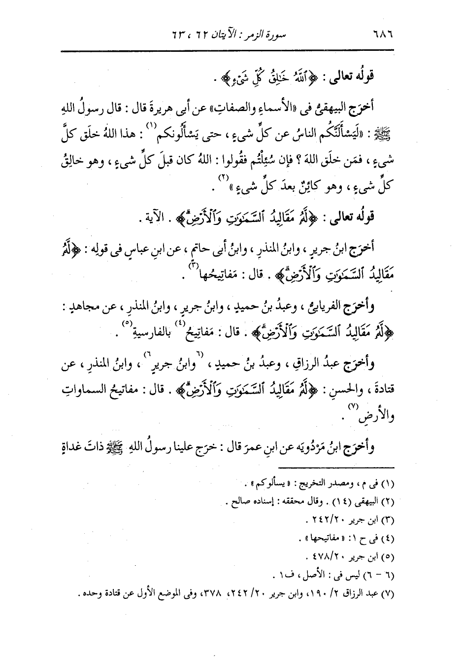 وأخرج عبد الرزاق ، وعَبد بن حُمَيد ، وَابن جَرِير ، وَابن المنذر عن قتادة والحسن رضي الله عنهما {له مقاليد السماوات والأرض} مفاتيحها.