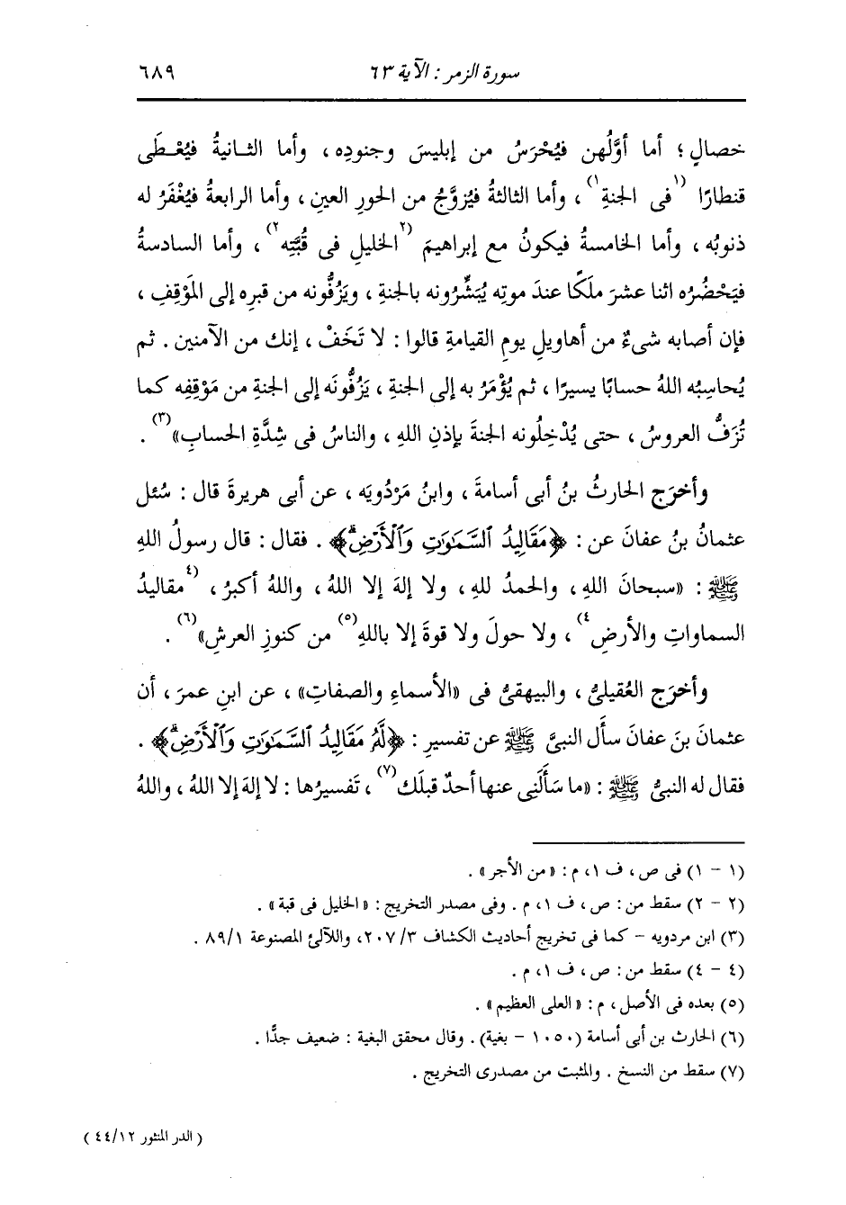 وأخرج الحارث بن أبي أسامة ، وَابن مردويه عن أبي هريرة رضي الله عنه قال : سأل عثمان بن عفان رضي الله عنه عن {مقاليد السماوات والأرض} فقال : قال رسول الله صلى الله عليه وسلم : سبحان الله والحمد لله ولا إله إلا الله والله أكبر ولا حول ولا قوة إلا بالله العلي العظيم من كنوز العرش.
