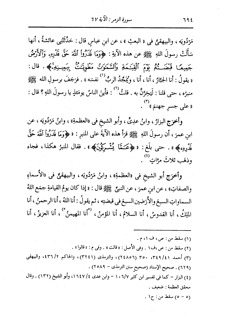 مردويه والبيهقي في البعث عن ابن عباس رضي الله عنهما قال : حدثتني عائشة رضي الله عنها أنها سألت رسول الله صلى الله عليه وسلم عن هذه الآية {وما قدروا الله حق قدره والأرض جميعا قبضته يوم القيامة والسماوات مطويات بيمينه} قال : يقول أنا الجبار أنا أنا ، ويمجد نفسه فرجف برسول الله صلى الله عليه وسلم المنبر حتى أن قلنا ليخرن به قالوا : فأين الناس يومئذ يا رسول الله قال : على جسر جهنم.