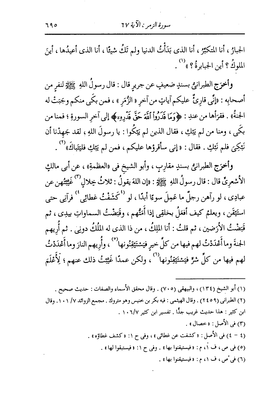 وأخرج الطبراني بسند ضعيف عن جرير رضي الله عنه قال : قال رسول الله صلى الله عليه وسلم لنفر من أصحابه : أنا قارى ء عليكم آيات من آخر الزمر فمن بكى منكم وجبت له الجنة ، فقرأها من عند {وما قدروا الله حق قدره} إلى آخر السورة فمنا من بكى ومنا من لم يبك فقال الذين لم يبكوا : يا رسول الله لقد جهدنا أن نبكي فلم نبك فقال : إني سأقرأوها عليكم فمن لم يبك فليتباك.