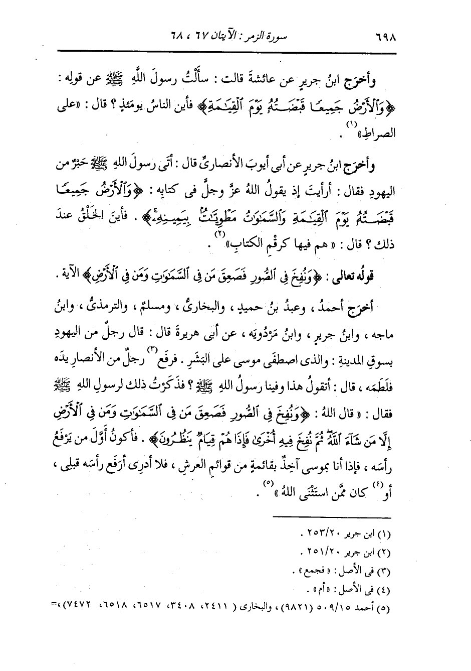 أَخرَج أحمد ، وعَبد بن حُمَيد والبخاري ومسلم والترمذي ، وَابن ماجة ، وَابن جَرِير ، وَابن مردويه عن أبي هريرة رضي الله عنه قال : قال رجل من اليهود بسوق المدينة : والذي اصطفى موسى على البشر ، فرفع رجل من الأنصار يده فلطمه قال : أتقول هذا وفينا رسول الله فذكرت ذلك لرسول الله صلى الله عليه وسلم فقال : قال الله {ونفخ في الصور فصعق من في السماوات ومن في الأرض إلا من شاء الله ثم نفخ فيه أخرى فإذا هم قيام ينظرون} فأكون أول من يرفع رأسه فإذا أنا بموسى آخذ بقائمة من قوائم العرش فلا أدري أرفع رأسه قبلي أو كان ممن استثنى الله عز وجل.