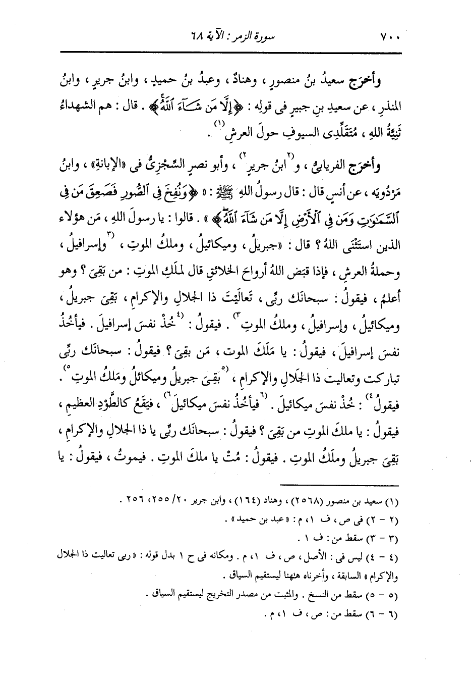 وأخرج الفريابي ، وعَبد بن حُمَيد وأبو نصر السجزي في الإبانة ، وَابن مردويه عن أنس قال : قال رسول الله صلى الله عليه وسلم {ونفخ في الصور فصعق من في السماوات ومن في الأرض إلا من شاء الله} قالوا : يا رسول الله من هؤلاء الذين استثنى الله قال جبريل وميكائيل وملك الموت وإسرافيل وحملة العرش ، فإذا قبض الله أرواح الخلائق قال لملك الموت : من بقي وهو أعلم فيقول : رب سبحانك ، رب تعاليت ذا الجلال والإكرام بقي جبريل وميكائيل وإسرافيل وملك الموت ، فيقول : خذ نفس ميكائيل ، فيقع كالطود العظيم ، فيقول : يا ملك الموت من بقي فيقول سبحانك رب ، ذا الجلال والإكرام بقي جبريل وملك الموت ، فيقول مت يا ملك الموت فيموت فيقول