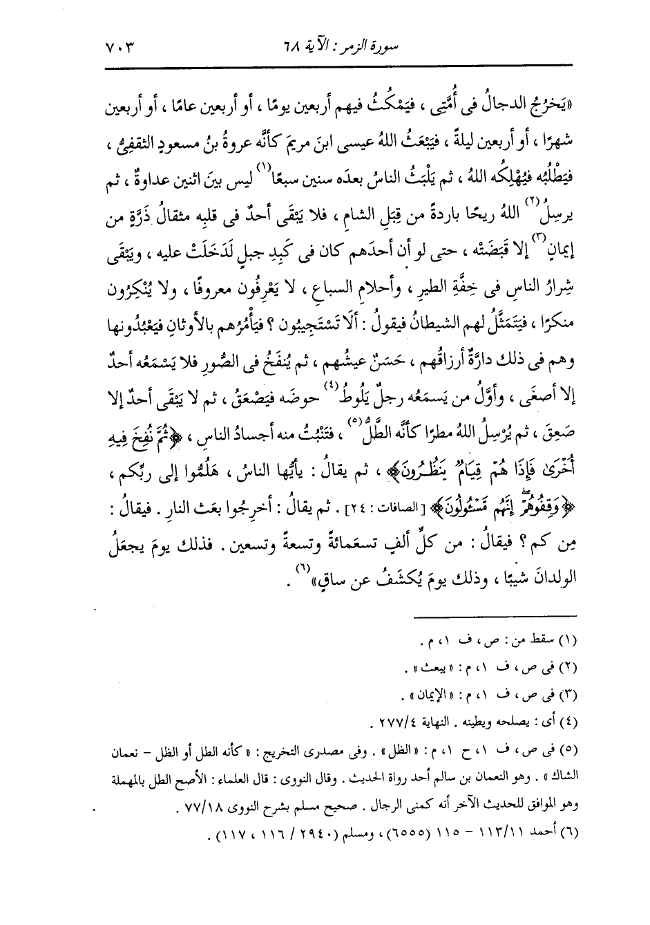 يخرج الدجال في أمتي فيمكث فيهم أربعين يوما أو أربعين عاما أو أربعين شهرا أو أربعين ليلة فيبعث الله عيسى بن مريم عليه السلام كأنه عروة بن مسعود الثقفي فيطلبه فيهلكه الله تعالى ثم يلبث الناس بعده سنين ليس بين اثنين عداوة ثم يبعث الله ريحا باردة من قبل الشام فلا يبقى أحد في قلبه مثقال ذرة من الإيمان إلا قبضته حتى لو كان أحدهم في كبد جبل لدخلت عليه ، يبقى شرار الناس في خفة الطير وأحلام السباع ، لا يعرفون معروفا ولا ينكرون منكرا فيتمثل لهم الشيطان فيقول : ألا تستجيبون فيأمرهم بالأوثان فيعبدوها وهم في ذلك دارة أرزاقهم حسن عيشهم ، ثم ينفخ في الصور فلا يسمعه أحد إلا صغى ، وأول من يسمعه رجل يلوط حوضه فيصعق ثم لا يبقى أحد إلا صعق ، ثم يرسل الله مطرا كأنه الطل فتنبت منه أجساد الناس {ثم نفخ فيه أخرى فإذا هم قيام ينظرون}