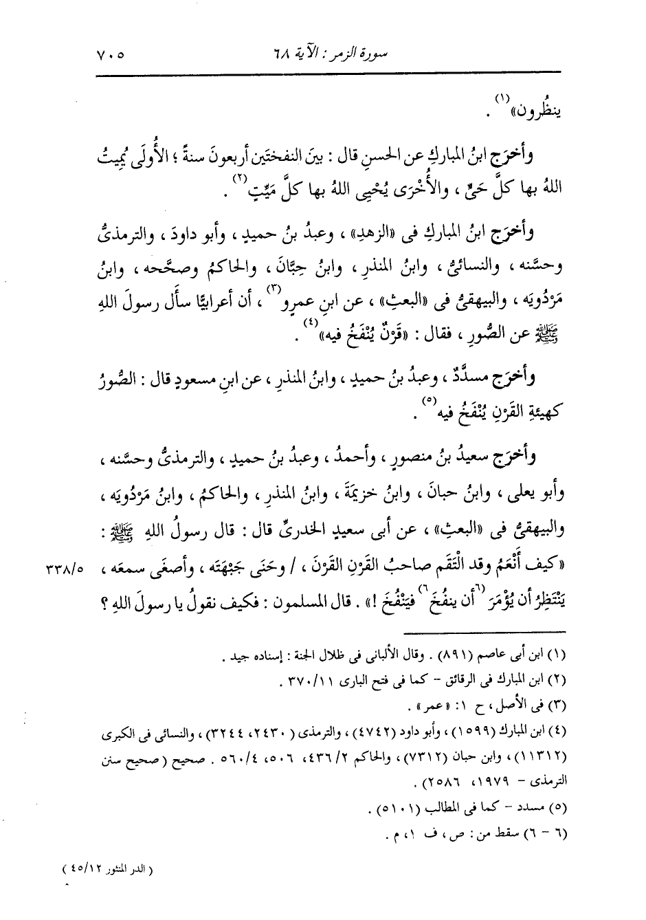 وأخرج ابن المبارك في الزهد ، وعَبد بن حُمَيد وأبو داود والترمذي وحسنه والنسائي ، وَابن المنذر ، وَابن حبان والحاكم وصححه ، وَابن مردويه والبيهقي في البعث عن ابن عمرو ، أن أعرابيا سأل رسول الله صلى الله عليه وسلم عن {الصور} فقال : قرن ينفخ فيه.