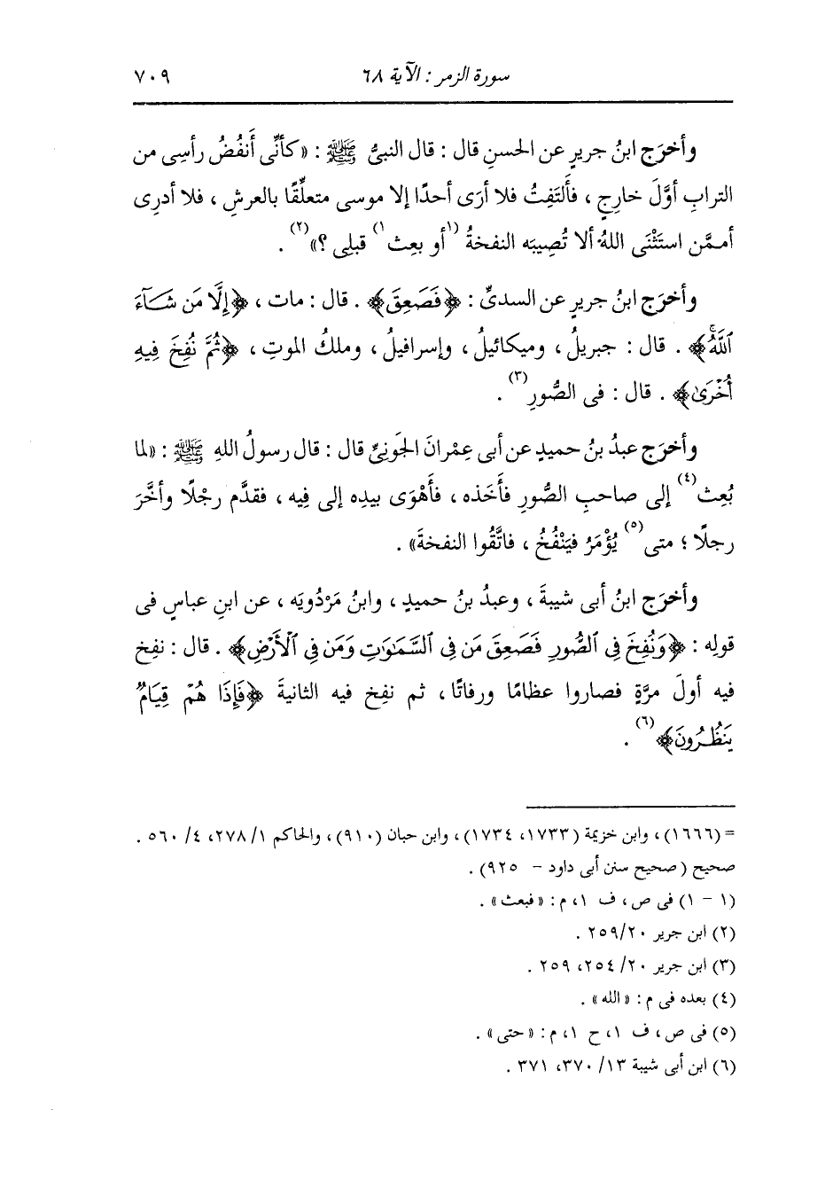 وأخرج ابن جرير عن الحسن قال : قال النَّبِيّ صلى الله عليه وسلم : كأني أنفض رأسي من التراب أول خارج فالتفت فلا أرى أحدا إلا موسى متعلقا بالعرش فلا أدري أممن استثنى الله أن لا تصيبه النفخة فبعث قبلي.